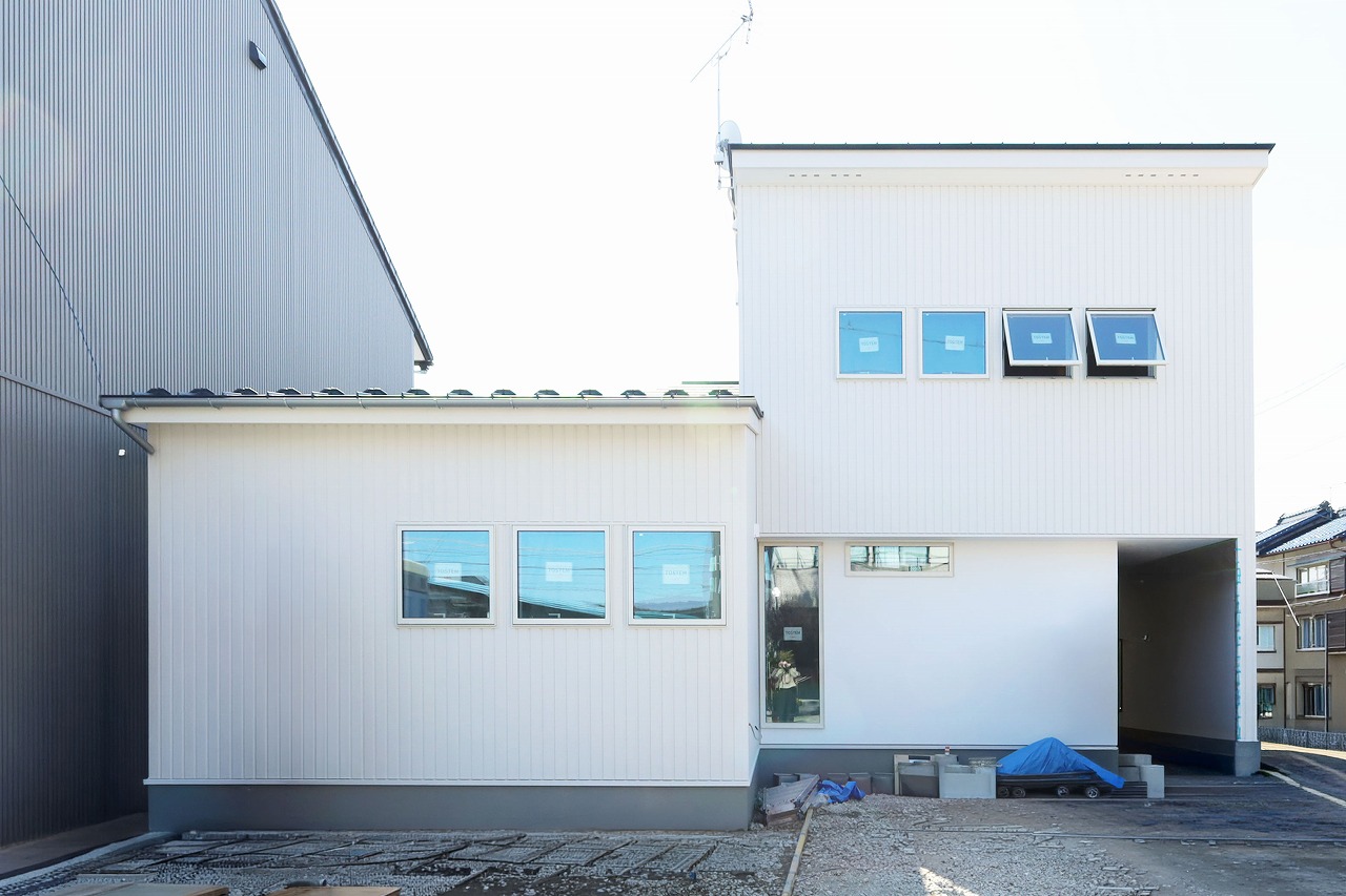 ホワイトのガルバリウムと前面に漆喰を施したシンプルな外観。玄関ポーチは木目調のサイディングを貼りアクセントにしました。