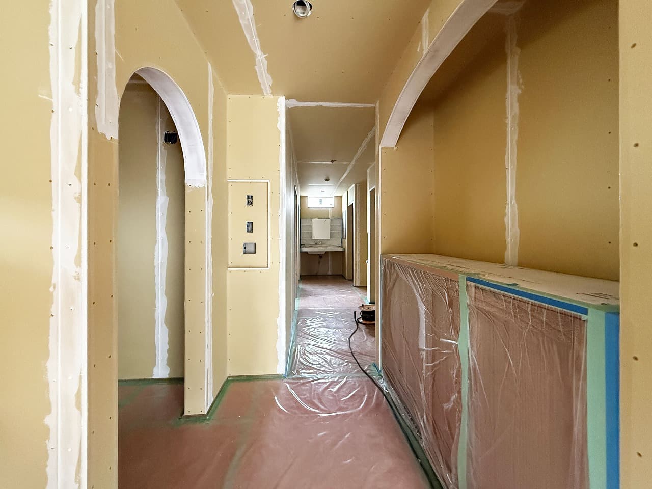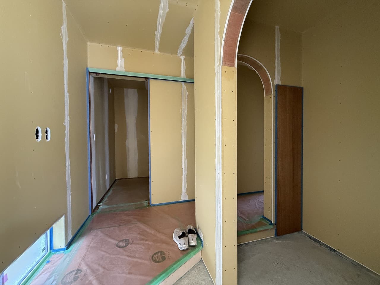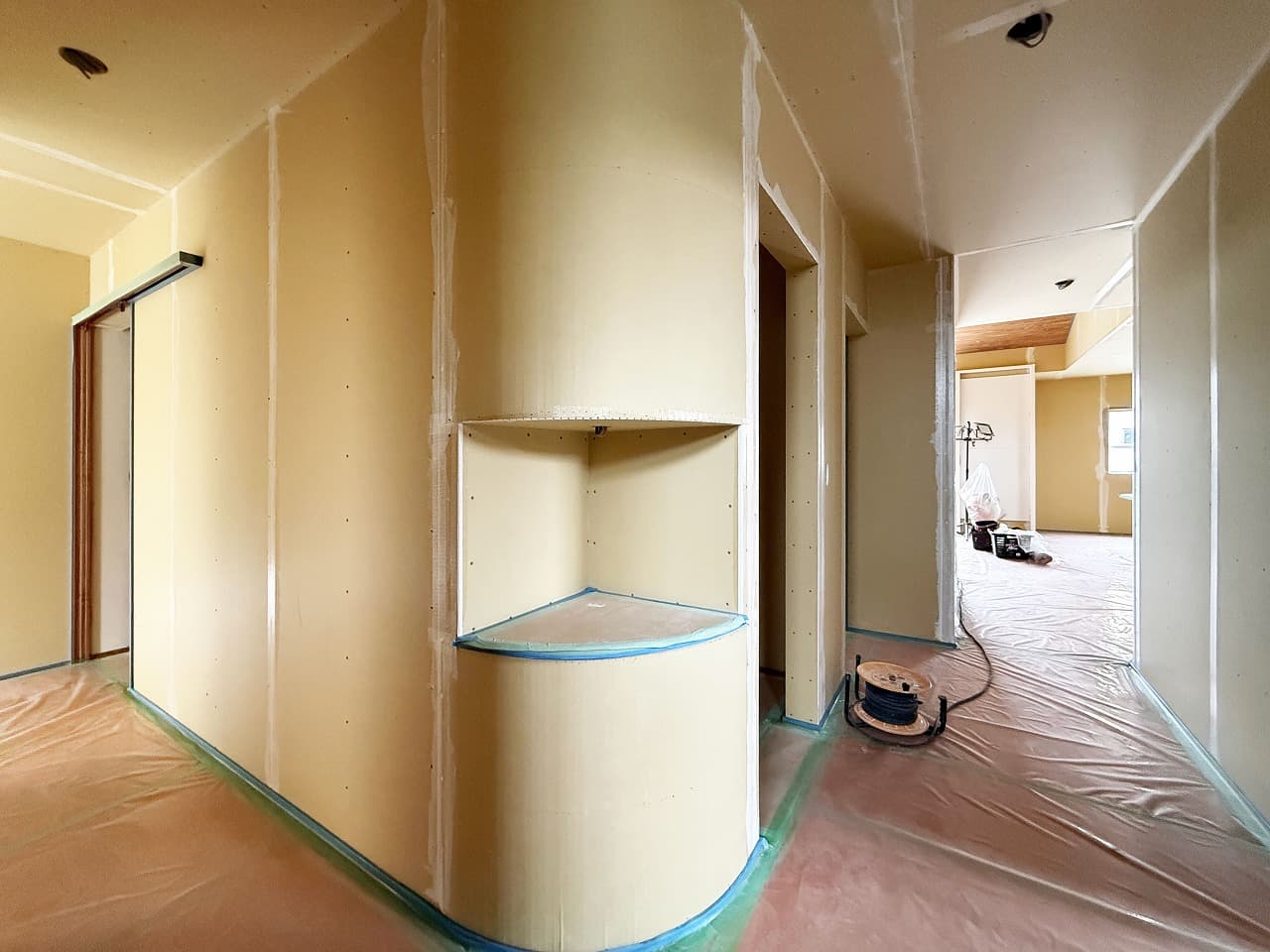 玄関ホールの先には約4帖のウォークスルークローゼットに繋がる動線と水廻りに繋がる2つの動線があります。コーナーをRの壁にしお気に入りの物を飾れるようニッチには間接照明を付けました。R壁にすることで柔らかく温かみのある空間が生まれますね^^
