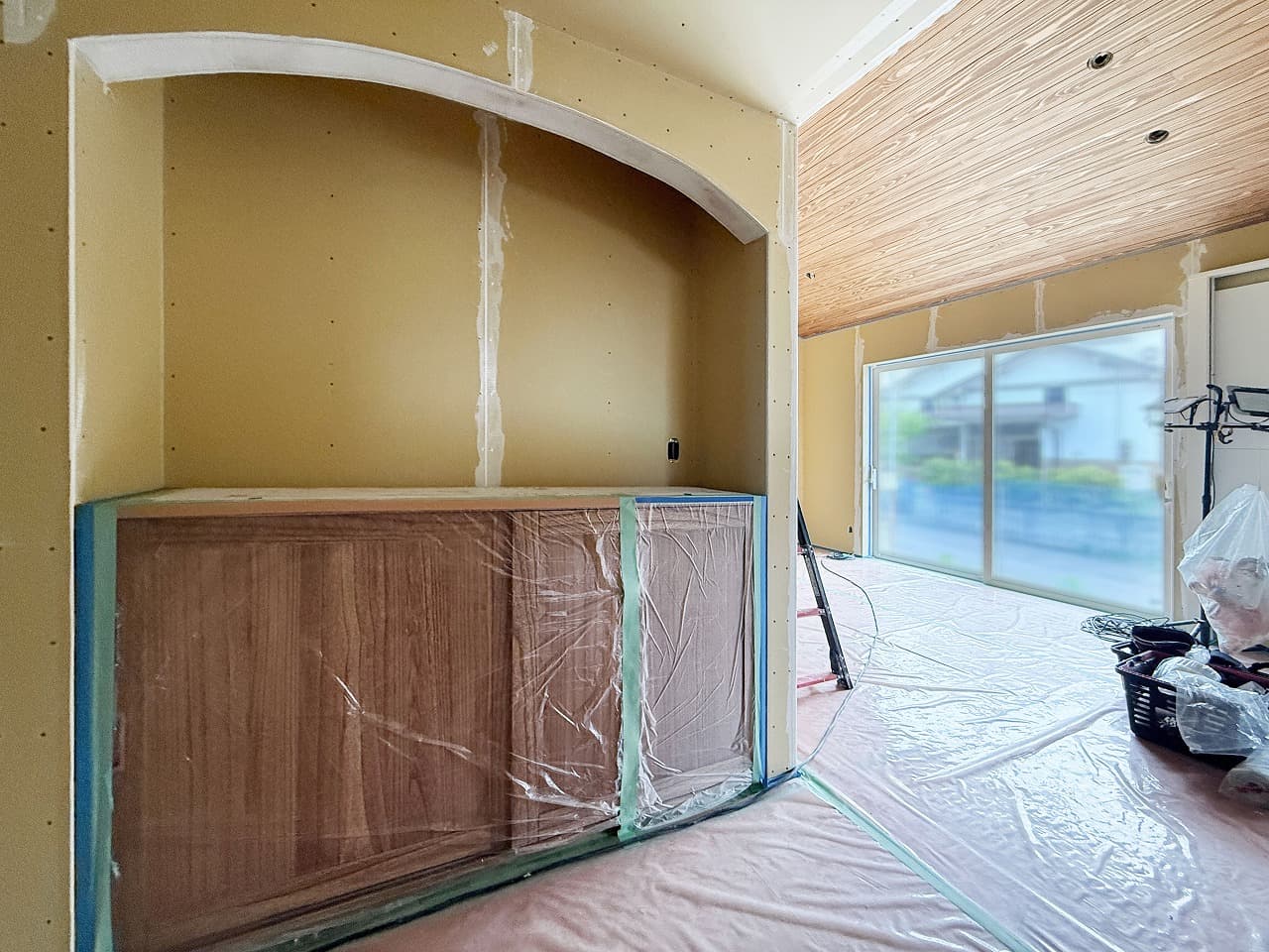 ウォークスルーパントリー入口、リビング収納兼飾り棚はRの垂れ壁にし柔らかい印象です。