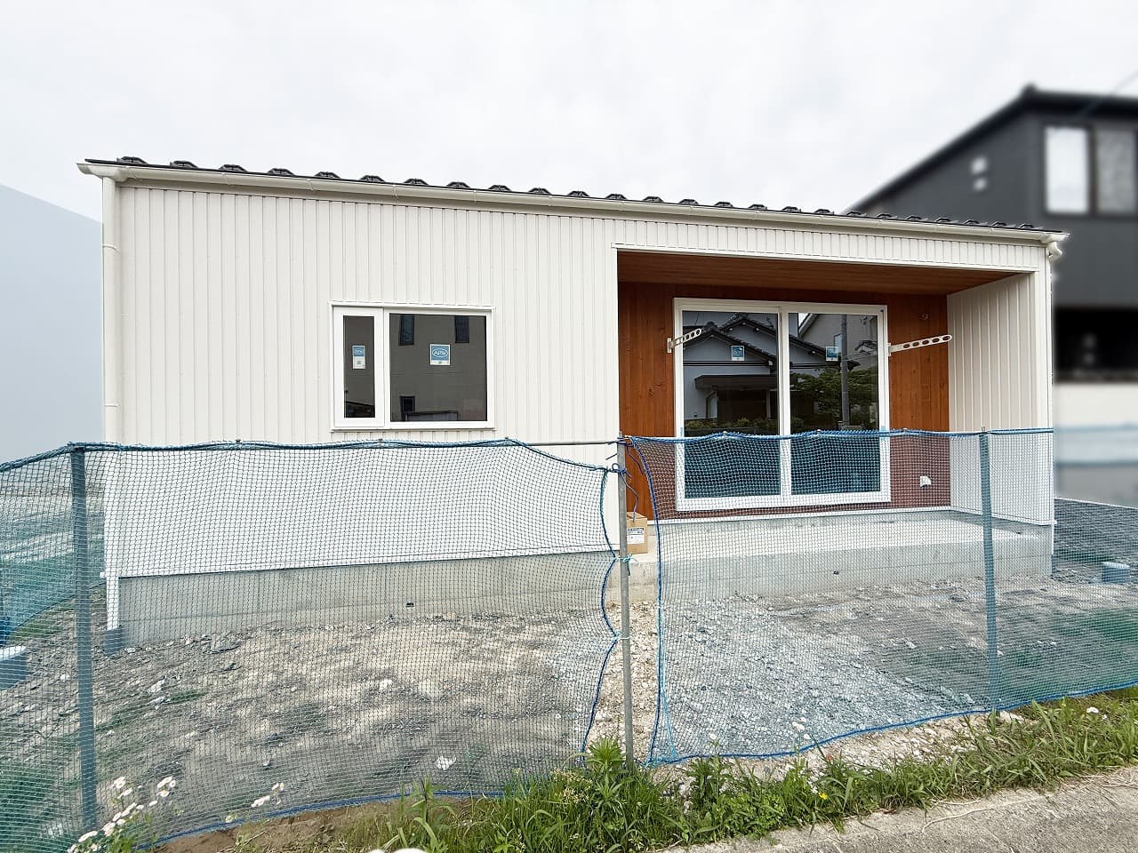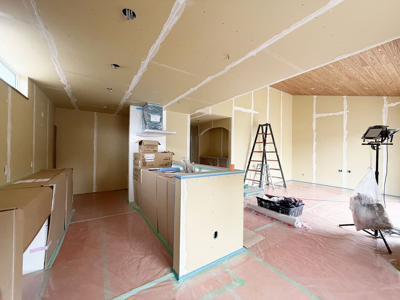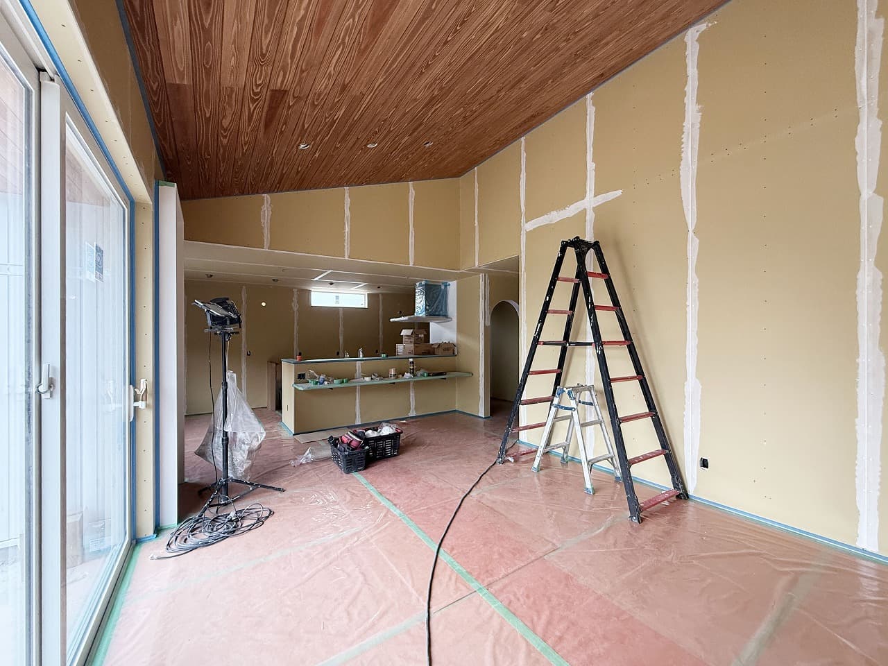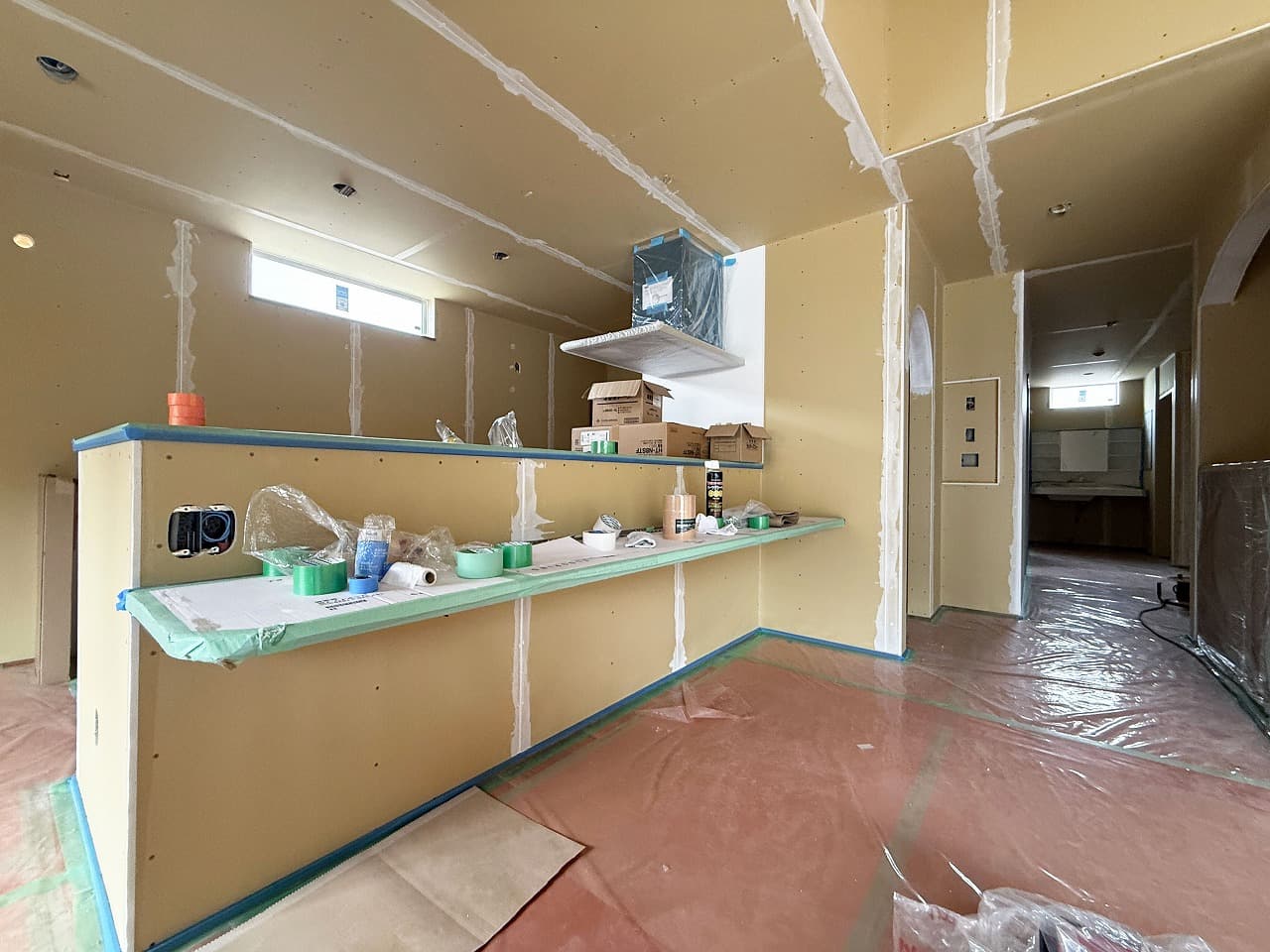 まだ建設途中ですが内観もご紹介。約23帖のLDKは勾配天井にし杉板を貼りました。平屋ながらもダイナミックで開放的な空間が広がります^^床はナラ無垢、壁は漆喰が塗られます。又こちらのお住まいには輻射式冷暖房パネルが設置されます。一台のエアコンと連携し、輻射熱で暖め冷やすので体に優しくエアコンが苦手な方におすすめ。冬は陽だまりのようにぽかぽか。夏は鍾乳洞のようにひんやり。今までにない新感覚がご体感いただけます。