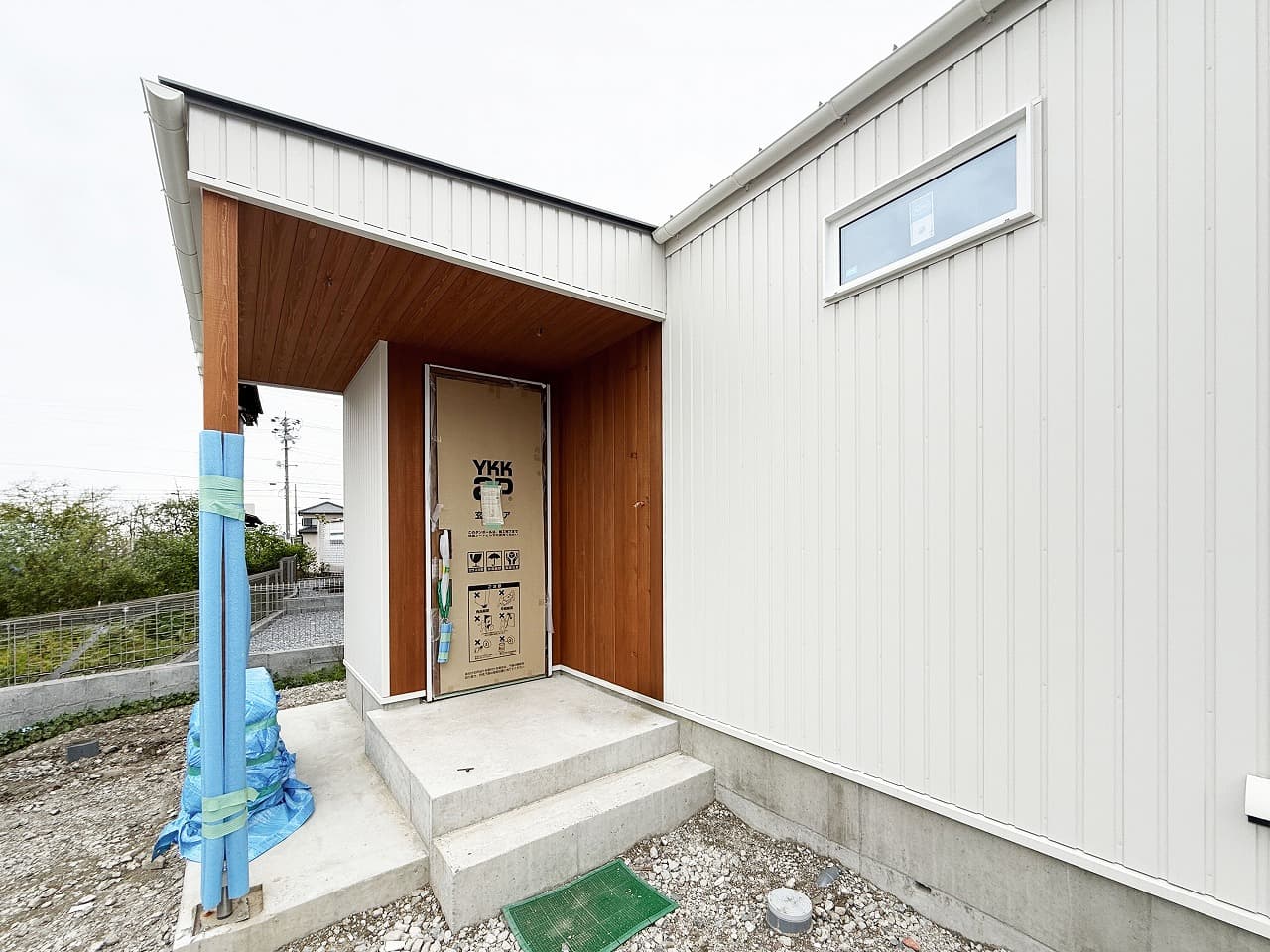 全面ホワイトのガルバリウム張り、玄関まわりとバルコニーの一部を杉板貼りでアクセントにしたモダンナチュラルな佇まいです。玄関の軒を少し伸ばし自転車を置けるように工夫しました。