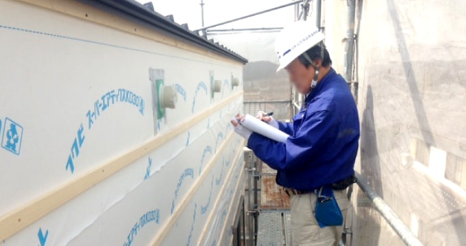 大工さんが造作に入り、外部のサッシや透湿防水シートを施工して防水処理をした段階で防水処理の状況と瑕疵を防止するために、JIOの検査員が検査をします。