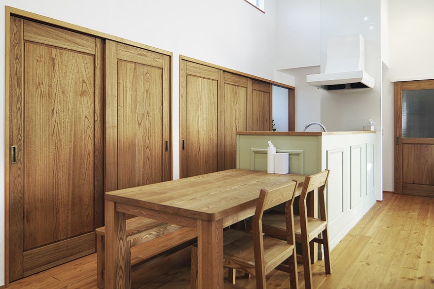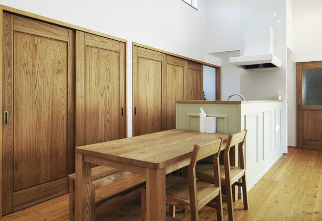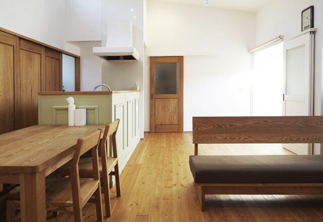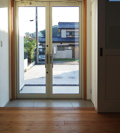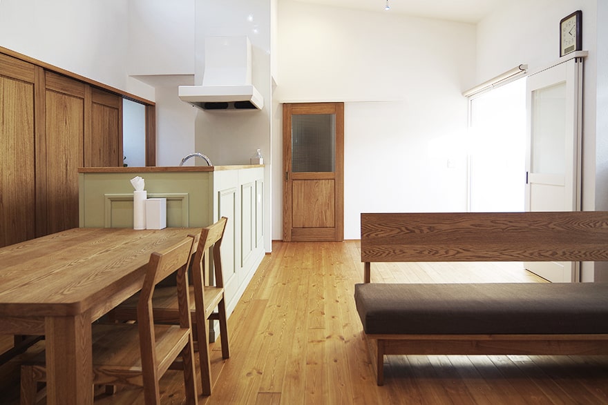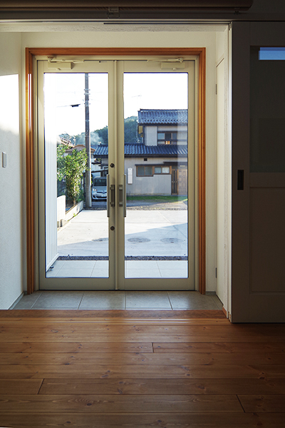 廊下のない無駄のない間取り。LDの掃き出し窓もいらなかったし、勝手口もいらない、ベランダもいらない、玄関ホールもいらない。いらないものを省いていきました。将来を見据えて平屋が良くて二階もいらなかったんですけど、長良川が近いので氾濫したときの為に二階をつくりました(笑)玄関のドアをガラスにしたのは掃き出し窓の代わり。いらないものに和室と客間もありました。この家に住む人の事を第一に考えて決めていきました。
