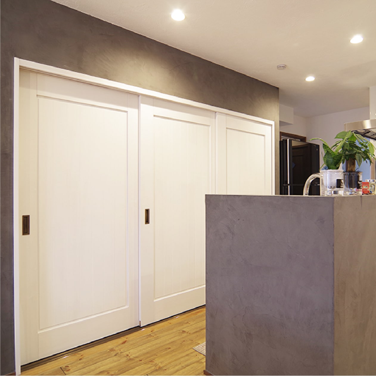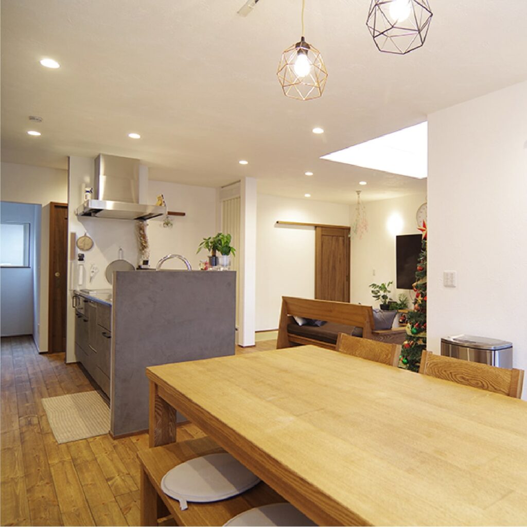 【内部】内装工事(漆喰・オガファーザー・パイン無垢・Be wood建具)・空調設備工事・タイル左官工事・電気工事・配管工事・設備設置工事・バス・トイレ(1F)・キッチン