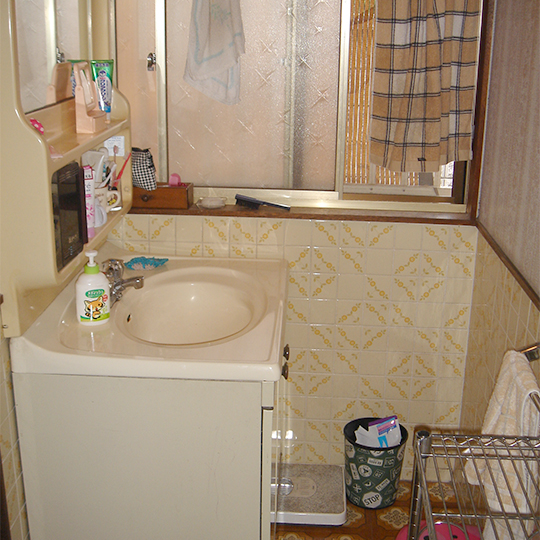 施主様お気に入りのタイルは洗面台にあしらわれました。単色をそのまま貼るのではなく、職人が色を見てバランスよい仕上がりに。派手すぎず重すぎない可愛らしい洗面台となりました。