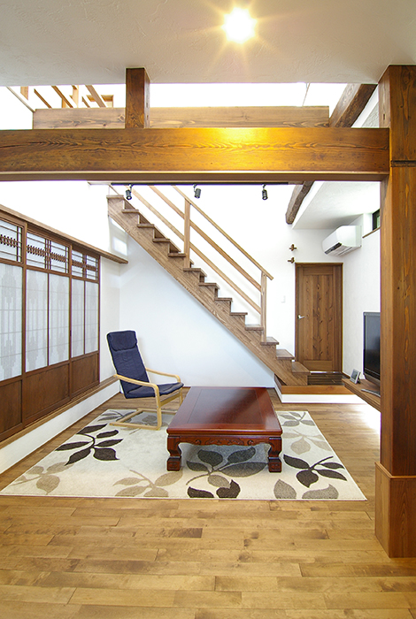 和室の一室を吹抜けにし、開放的なリビングにリフォーム。化粧梁は元々あった梁を利用し、おしゃれな空間に仕上がっています。自社製(BeWood)の建具と既存の建具の色を合わせることでリフォームした部屋だけでなく、家全体の雰囲気も統一されました。