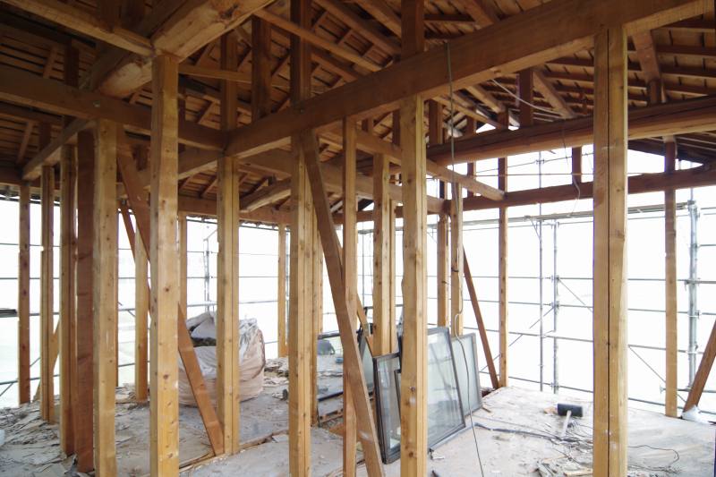 リノベーション後は吹き抜けを作る予定ですが、解体をしてみると想定とは違った梁の組み方がしてあったため、梁を組み替えて見栄えと構造の補強をしていきます。