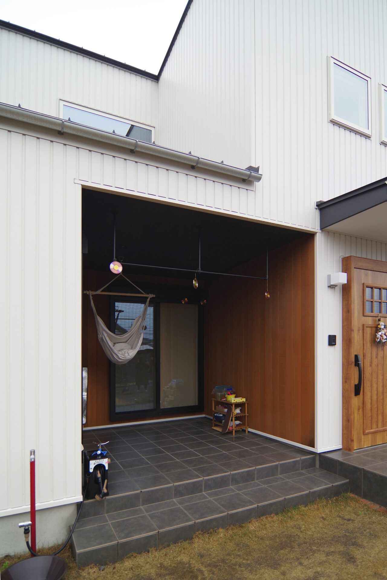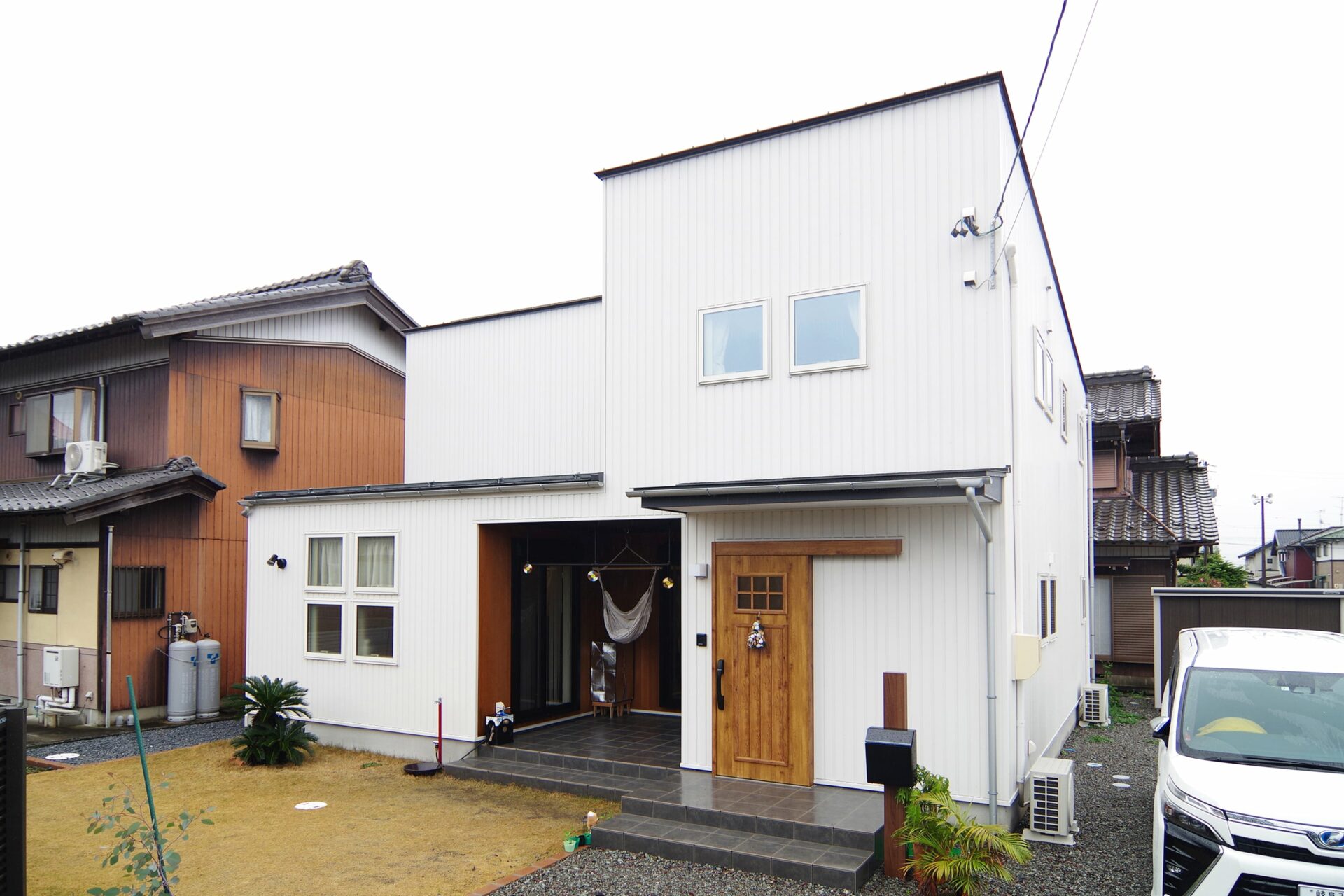 白いガルバリウムと、テラスに張った無垢材がアクセントとなった外観。