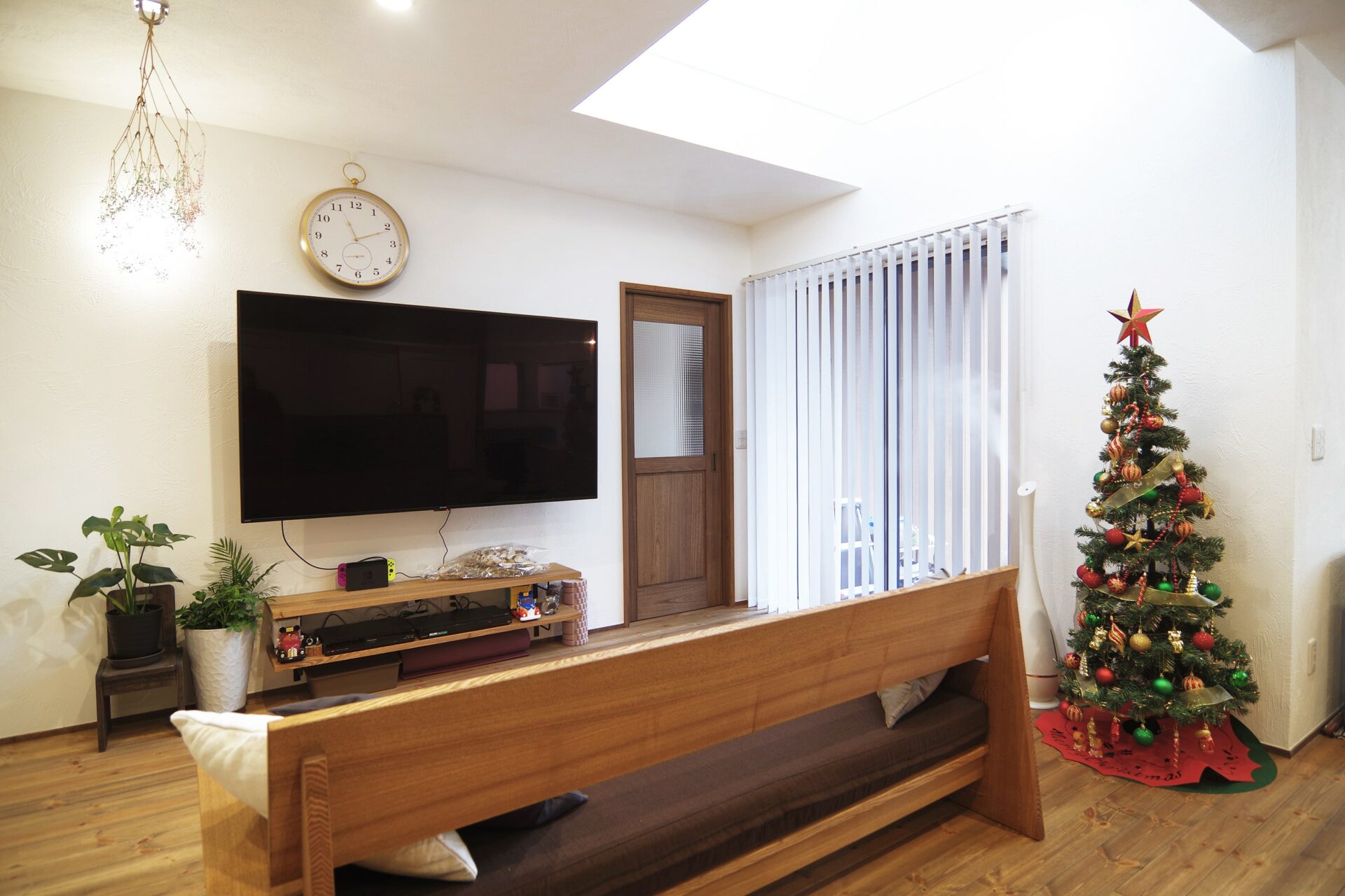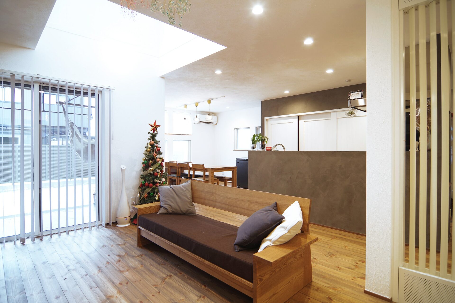 吹き抜けとテラスをコの字型に囲む間取りで陽光をしっかりと取り込む明るいLDK。造作家具のソファーはシンプルな空間にもよくなじみます。