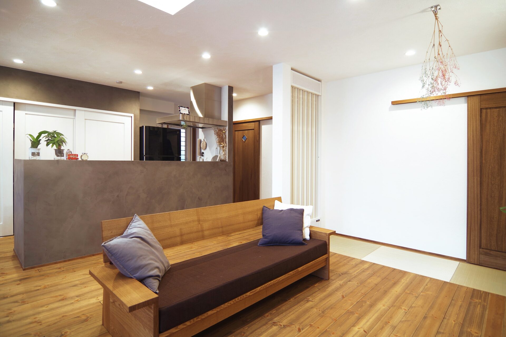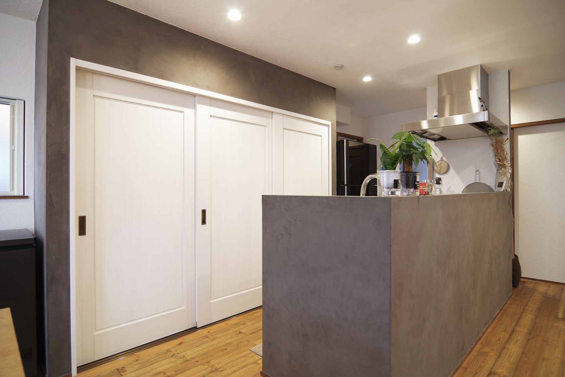 キッチンカンターにはモールテックスを使用。また、背面収納は建具で隠せるように設計。急な来客にもさっと隠せてとても機能的です。
