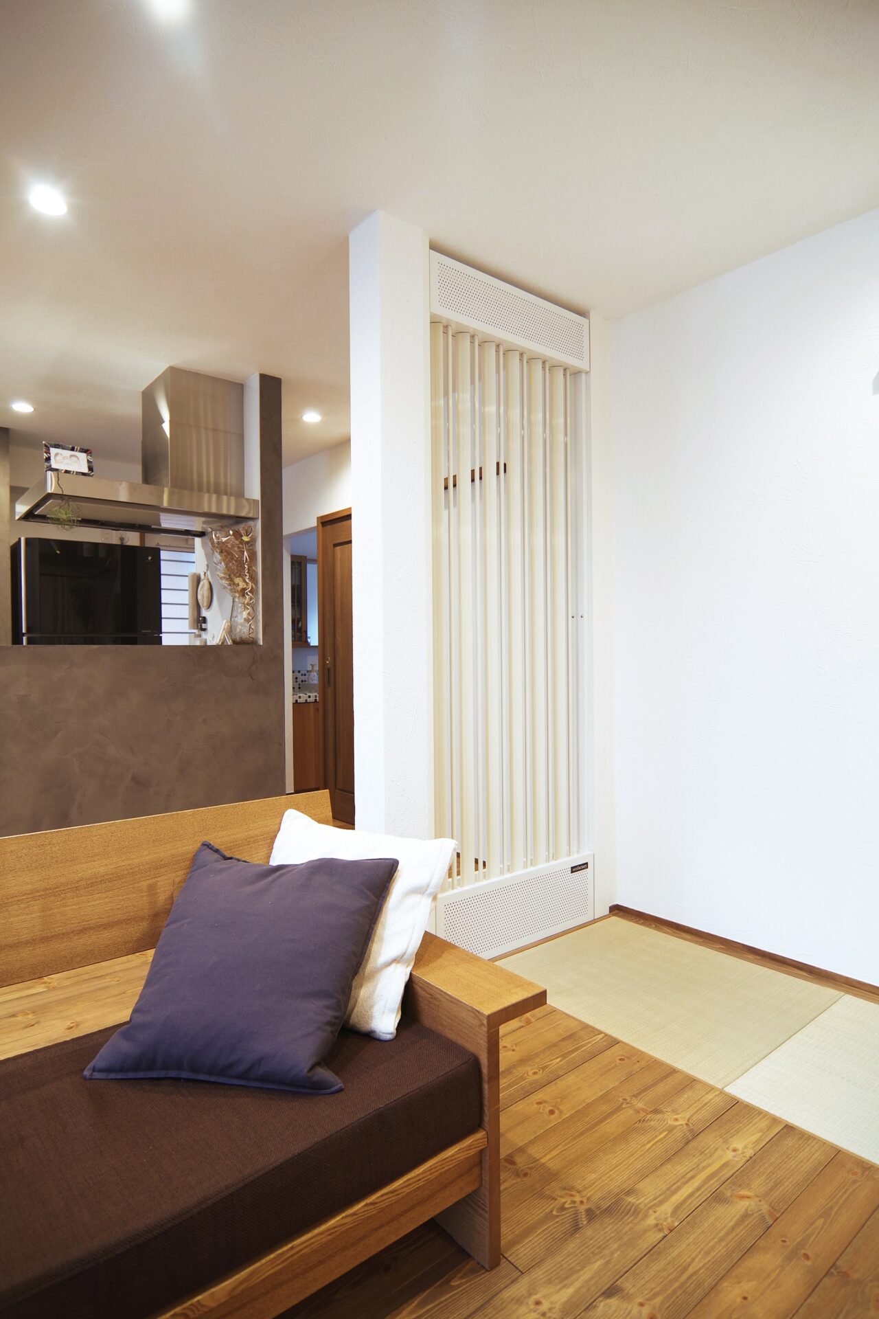 一台のエアコンと連動し家全体を暖める「輻射式冷暖房パネル」。輻射式なので、冬は体の芯まで温まり夏は鍾乳洞の様にひんやり。