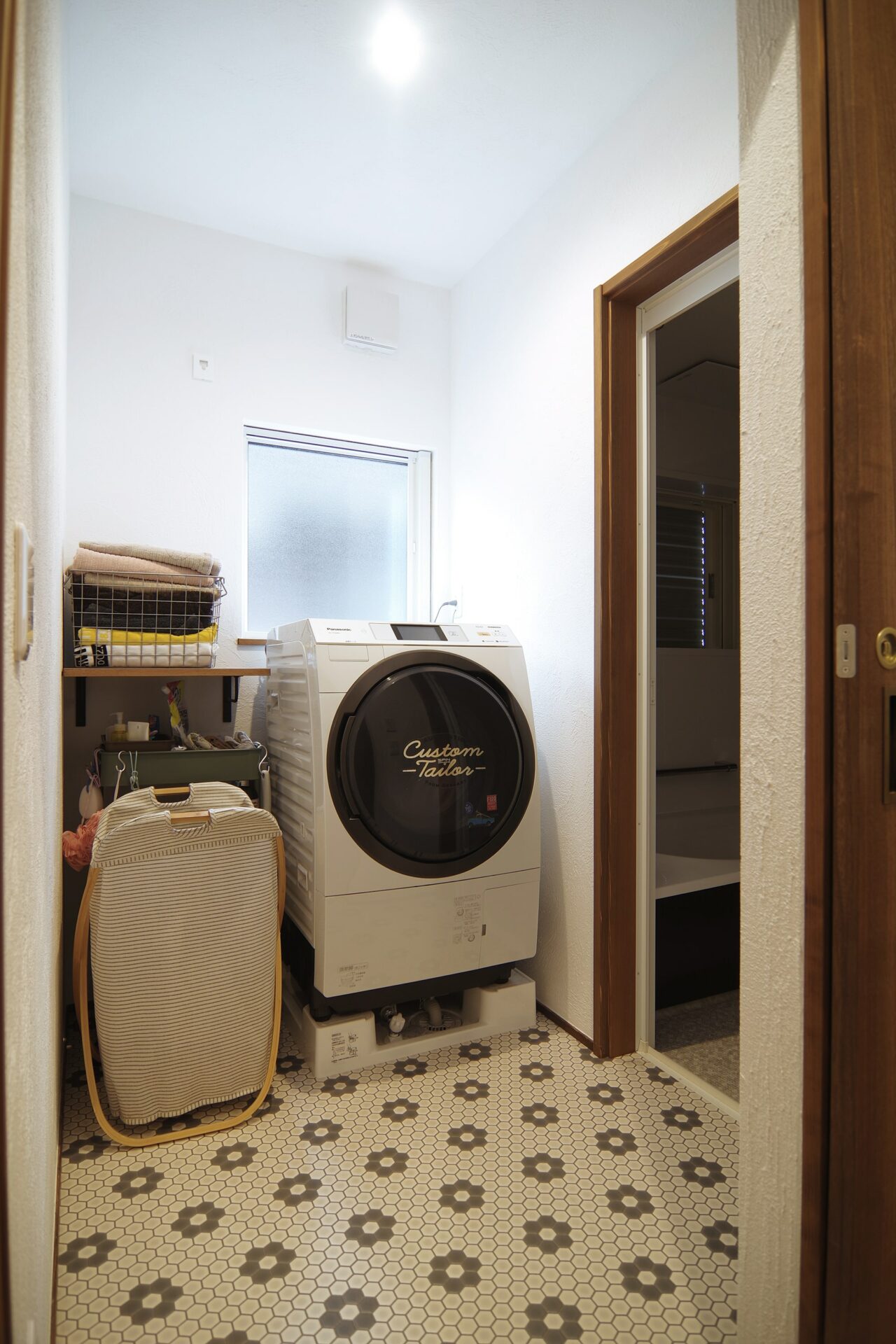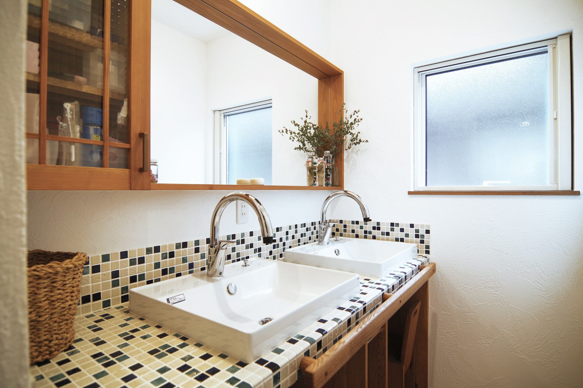 造作の洗面化粧台は洗面ボウルを2つに。朝の混雑する時間もストレスなく使えます。