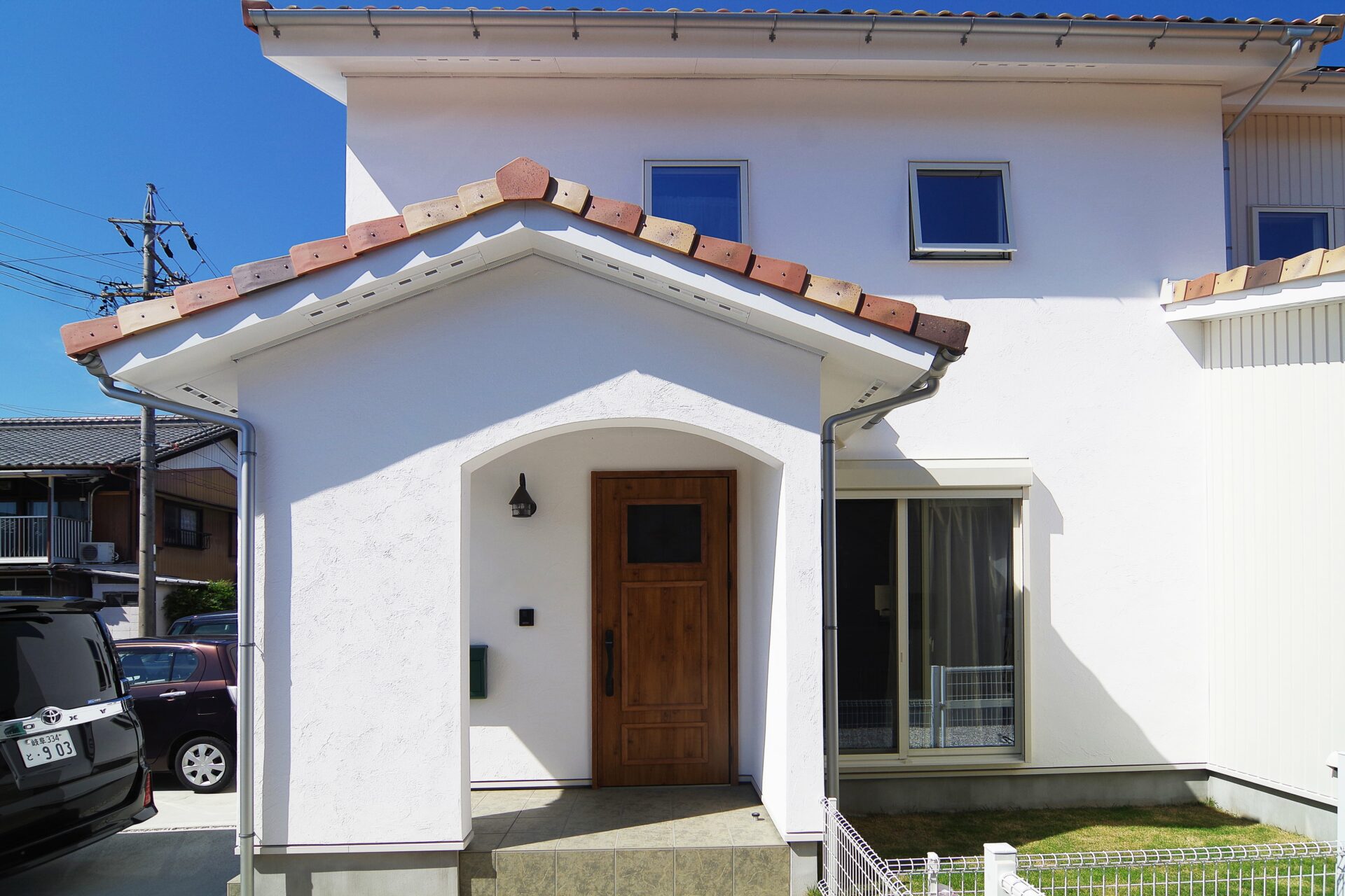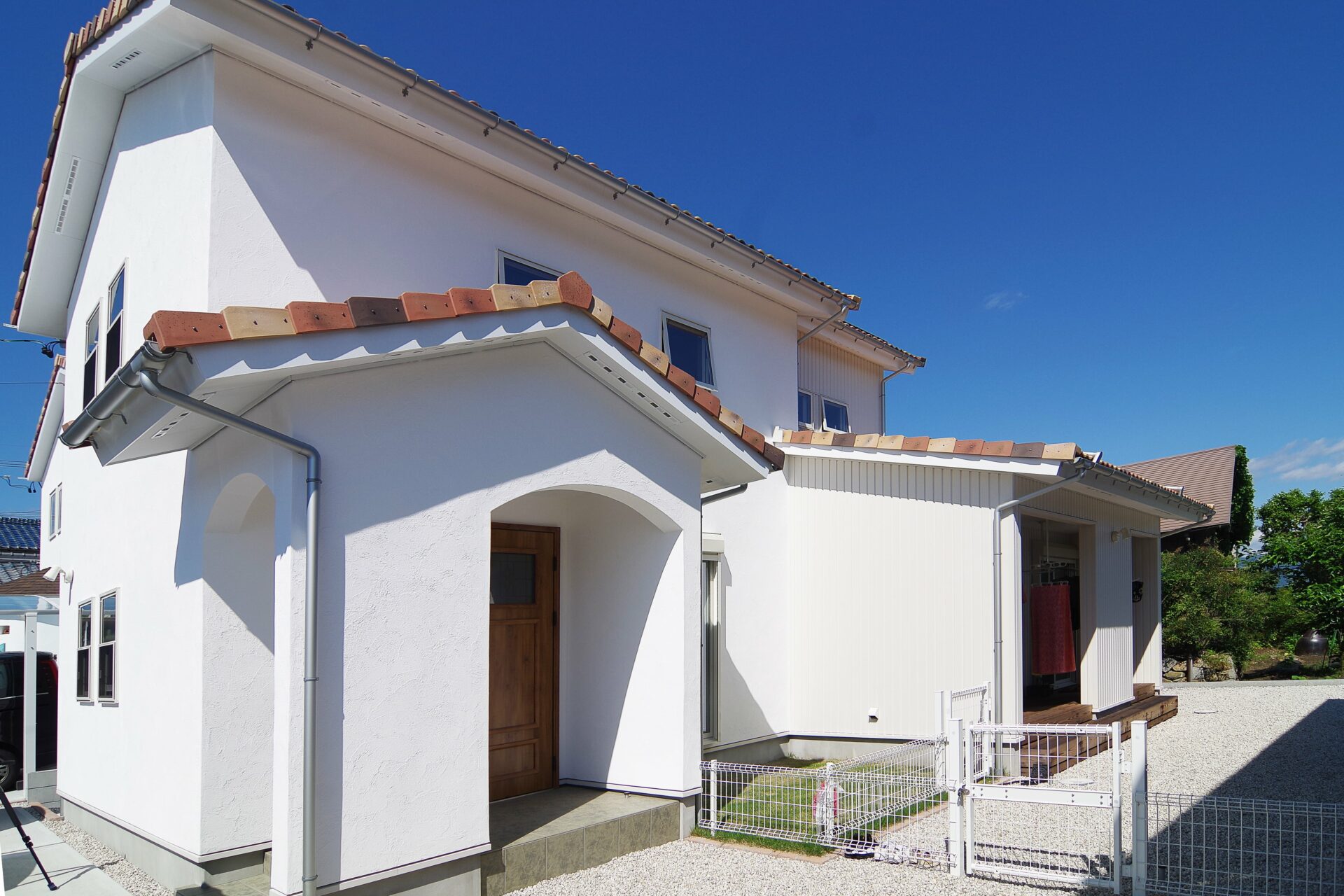 オレンジの瓦屋根と漆喰の白がまぶしい南欧風の外観。