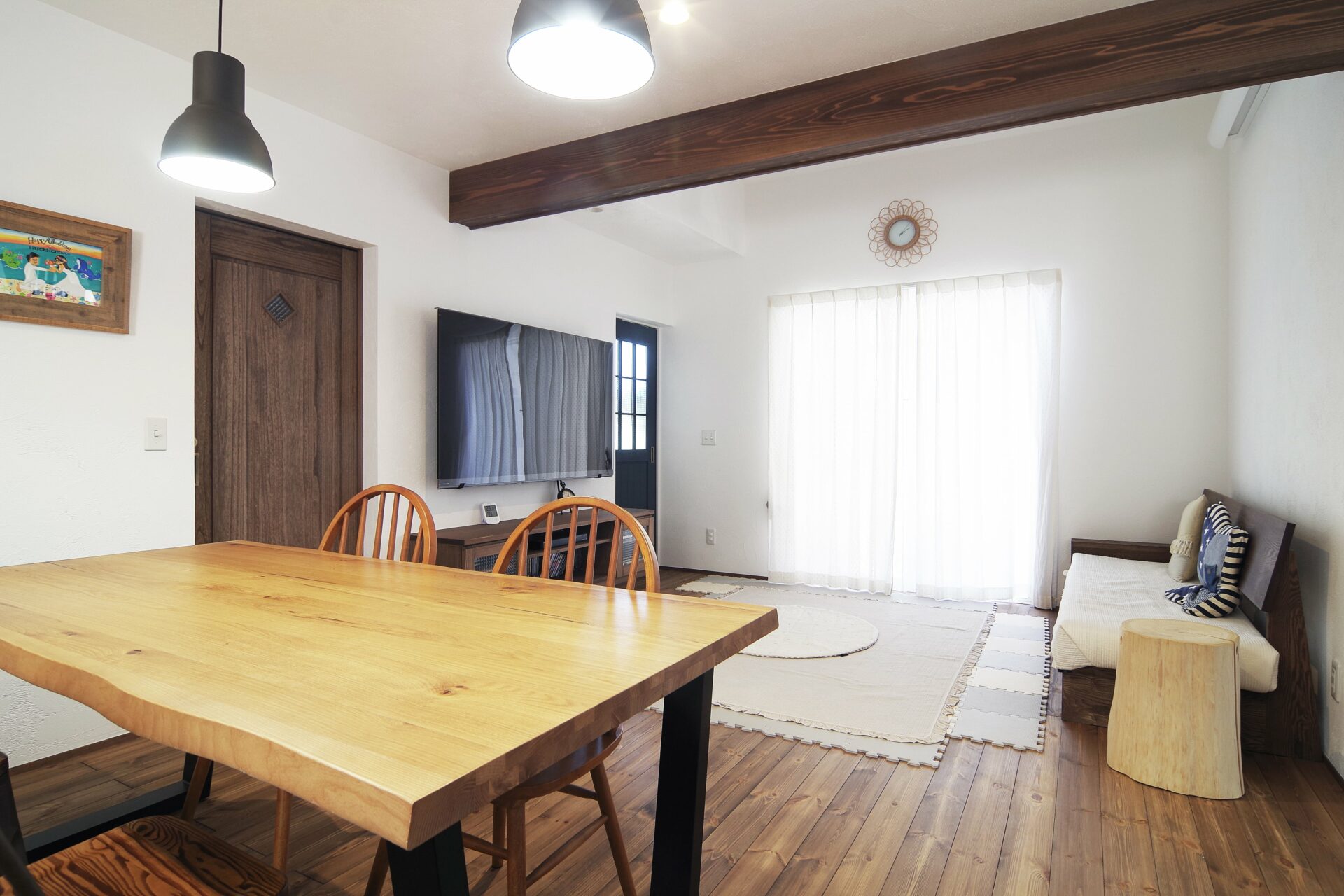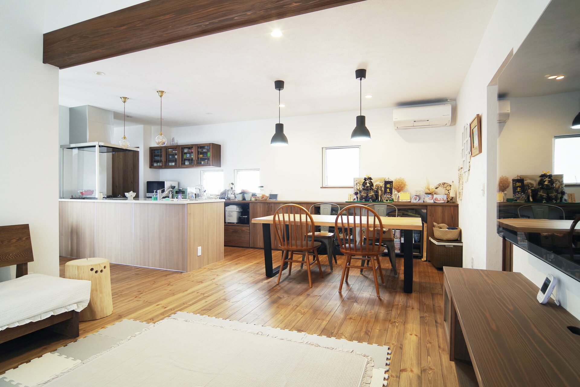 木のぬくもりが感じられる落ち着いた雰囲気のリビング 存在感のある梁がアクセントに