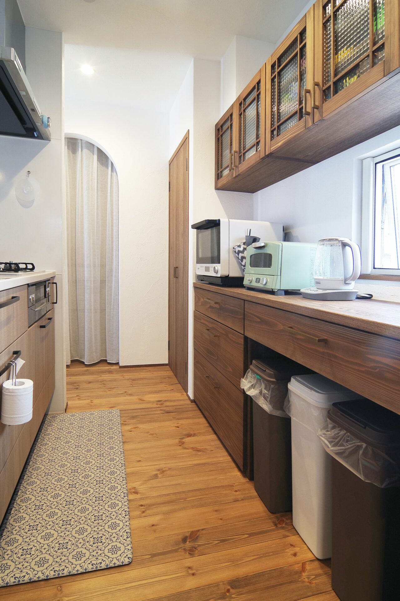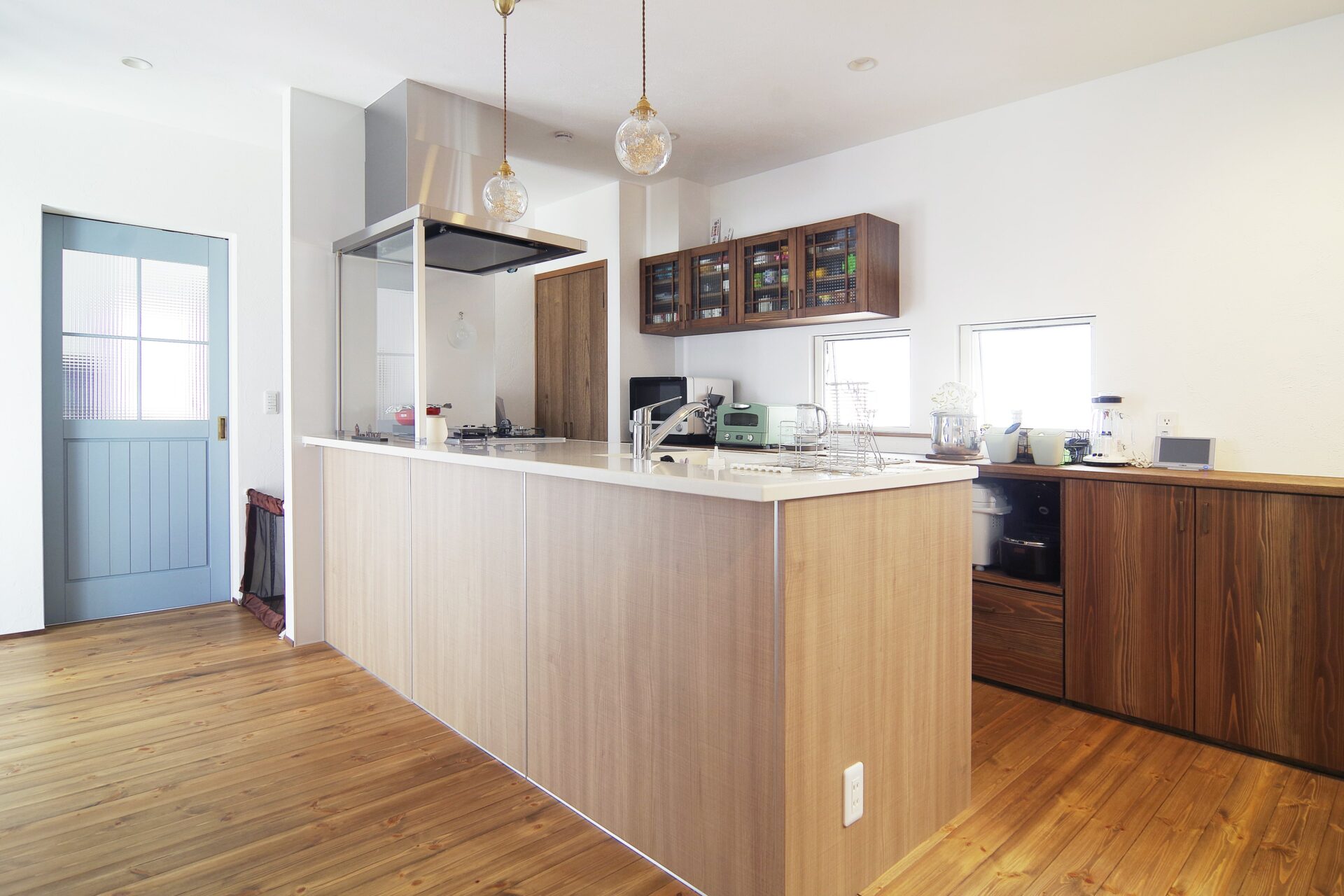 シンプルなキッチンは回遊することができ、いつもご夫婦二人で料理をするのでとても使いやすいそう。