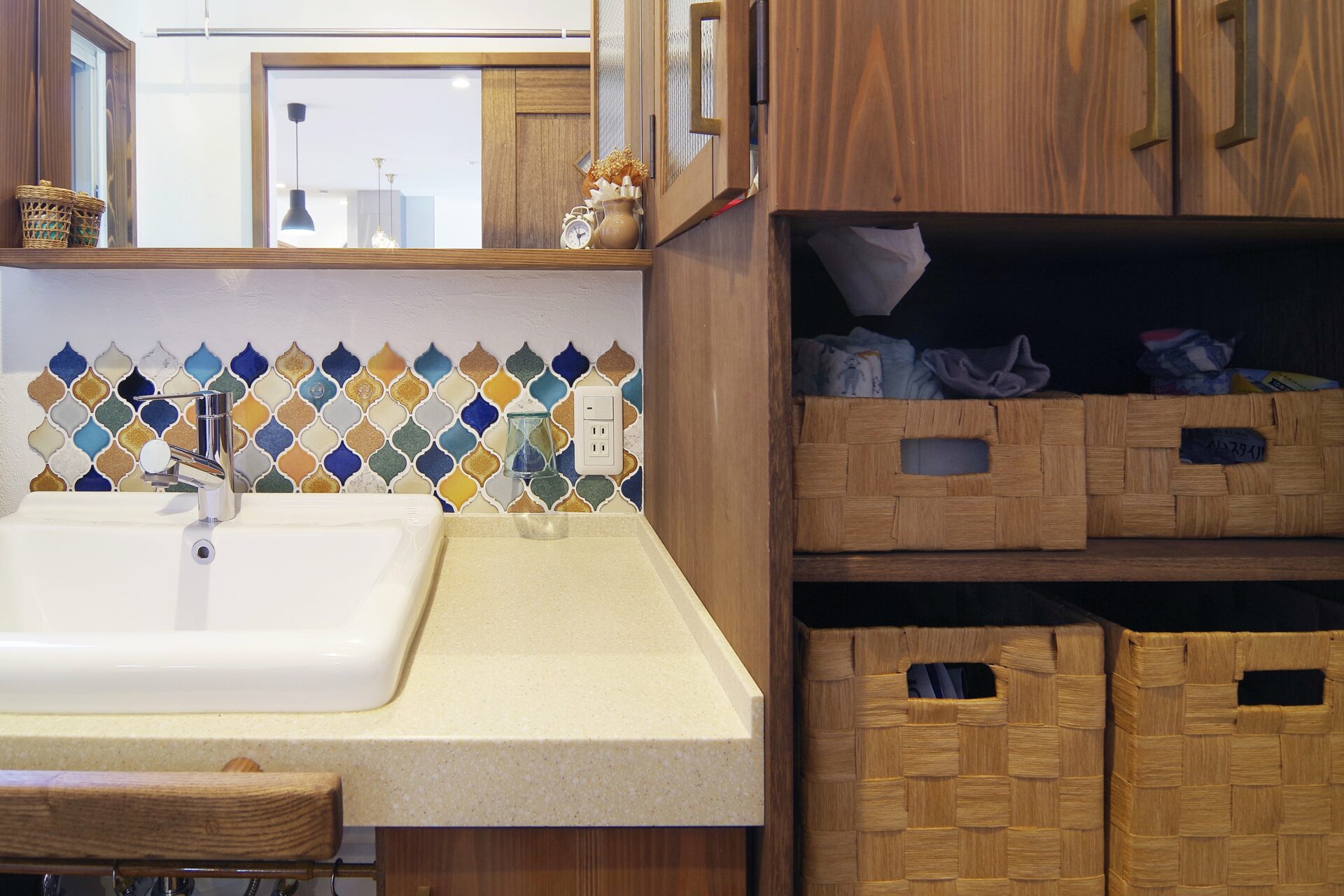 カラフルなコラベルタイルがアクセントの洗面化粧台 濃い目の色で塗装された無垢材ともよく合います。