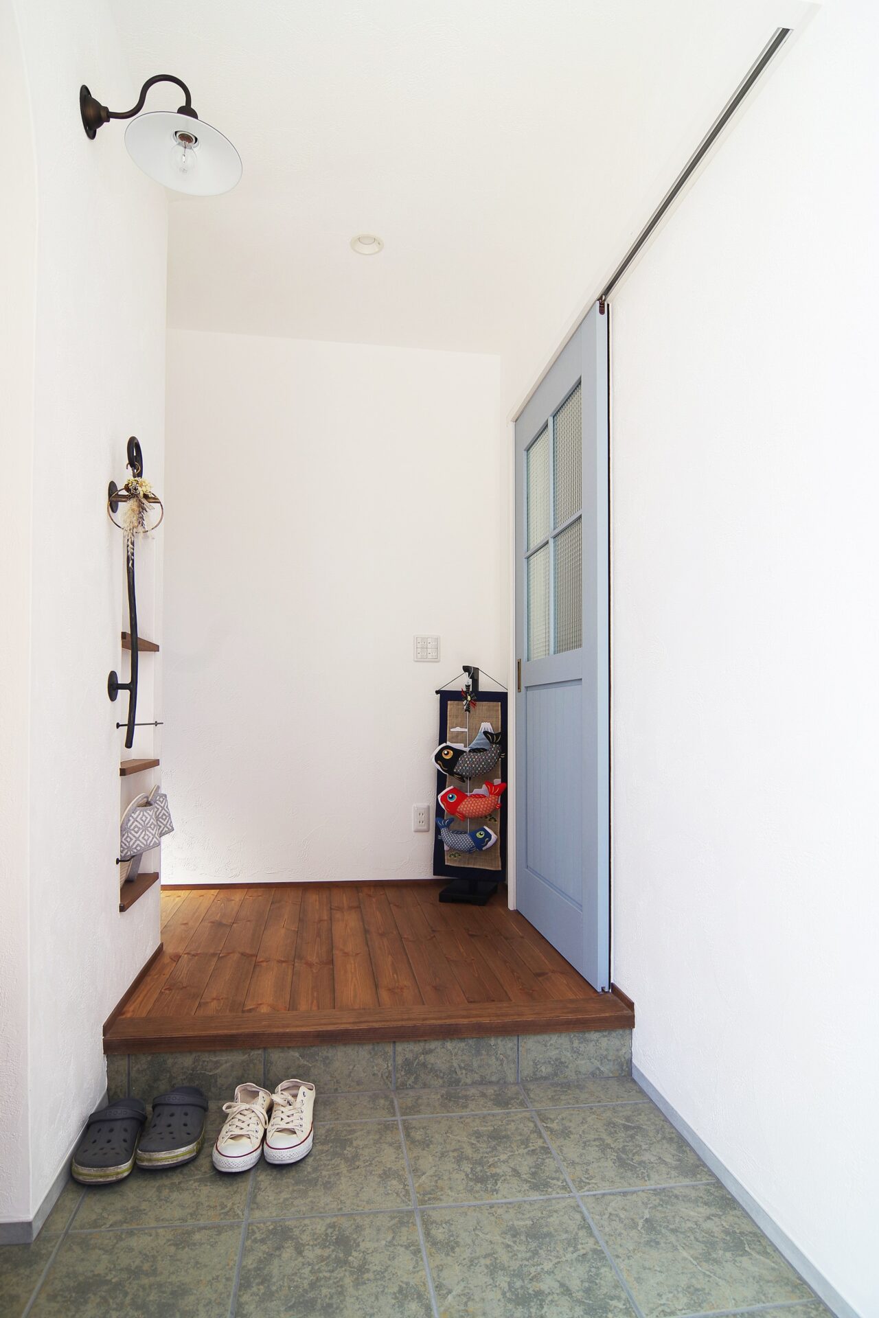玄関ホールはすっきりとした印象 水色の建具がさわやかです。