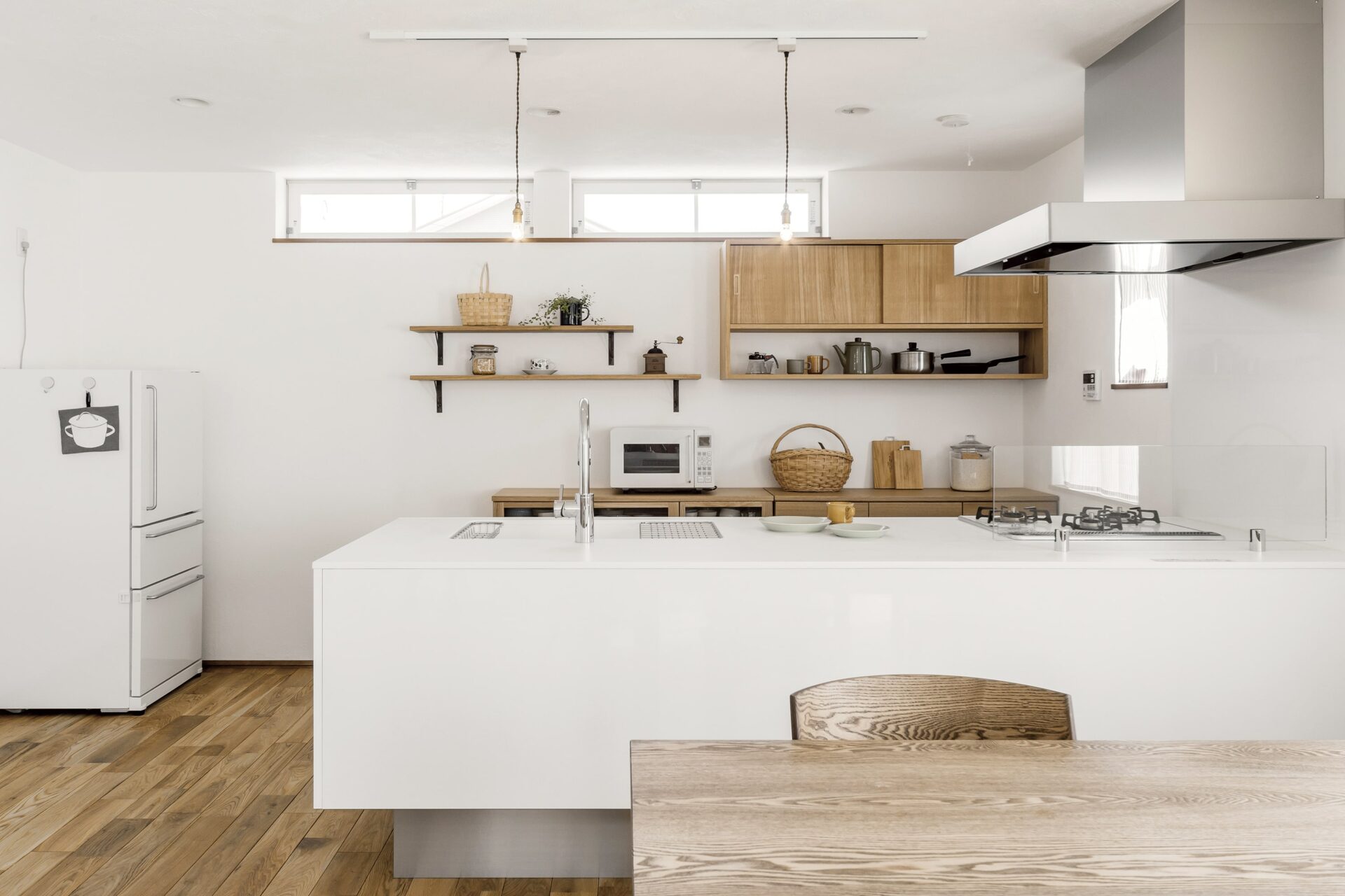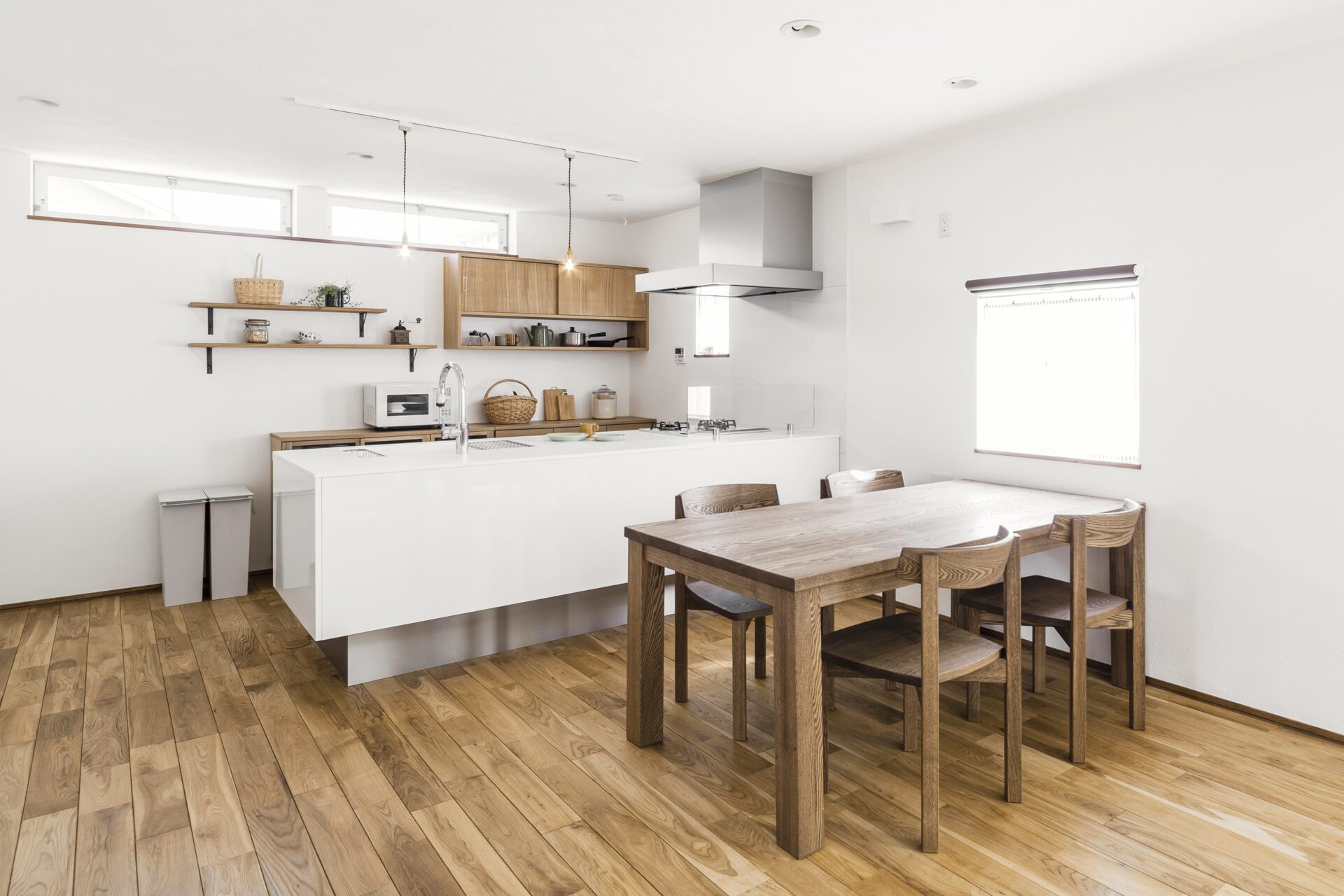 一切の無駄を配したシンプルモダンな内装の豊田市N様邸。展示場でこれまでにない美しい空気の質や無垢材の歩き心地を体感し、こんな自然素材の家で我が子を子育てできたらと感じたN様。空間に馴染むようにスクエアキッチンをチョイスし、自社で造作されたアンティーク調のダイニングセットでシンプルモダンなおうちカフェを実現しました。