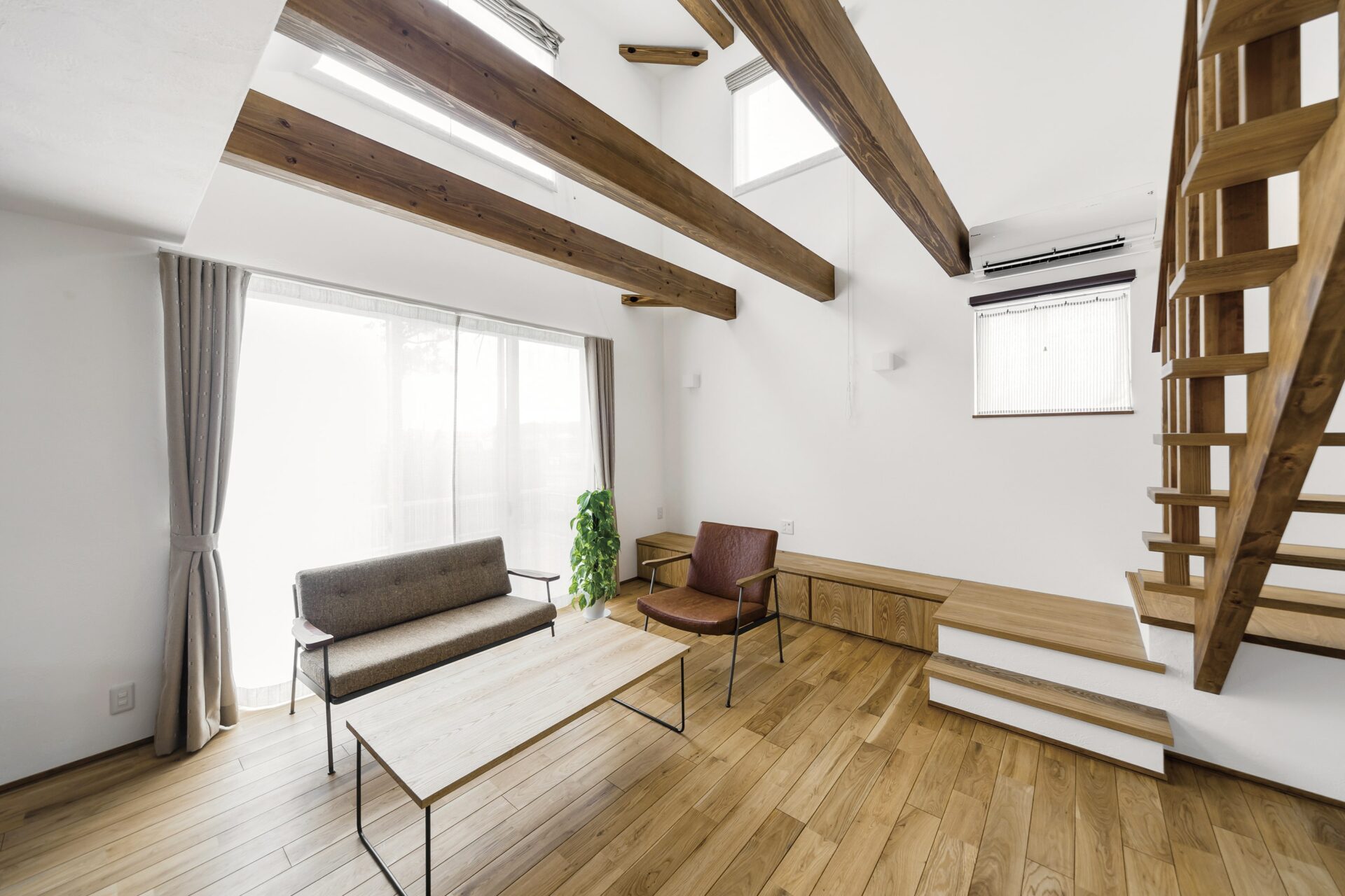 「できるだけモノを増やしたくない」という考えから収納は必要最低限にし、広々としたLDKには一日の疲れを癒すお施主様こだわりの大胆な吹抜けを設けたお住まいです。