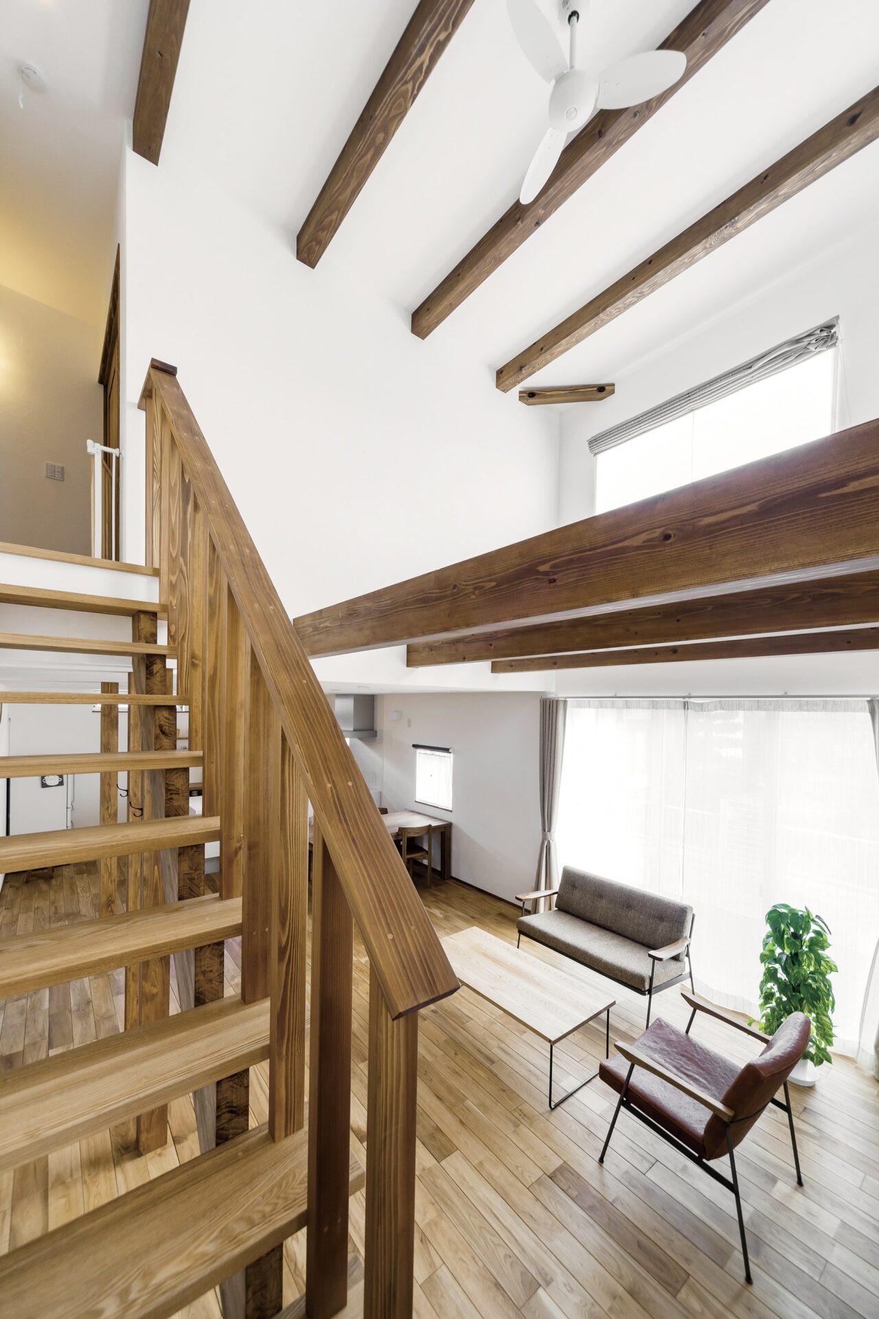 大きな吹抜けにインパクトのある太い化粧梁が印象的。ストリップになっている階段からはLDKが見渡せ、開放感のある空間に。