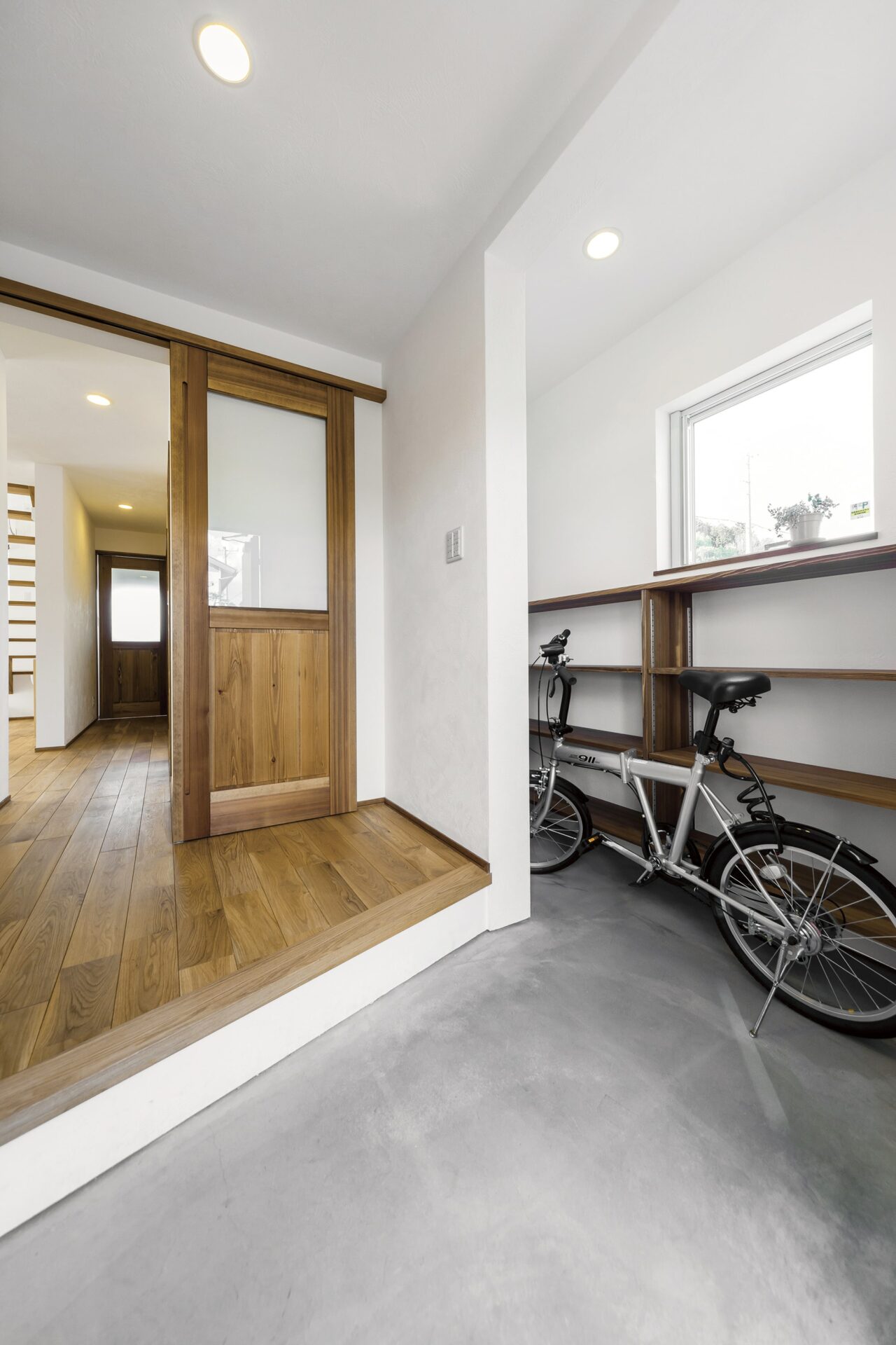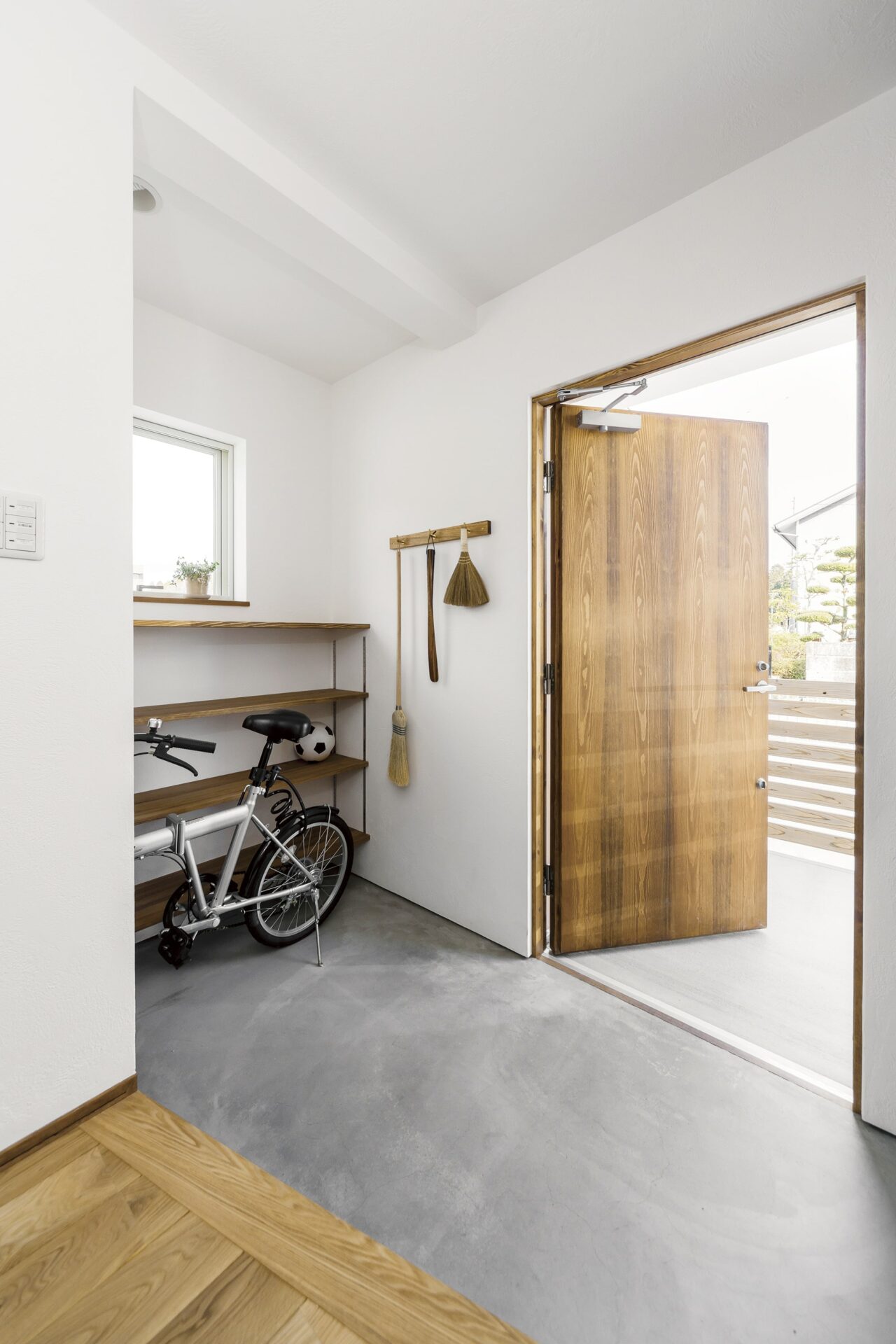 モルタルで仕上げた広い玄関。モノトーンと無垢材の玄関ドアで統一感あふれる雰囲気に仕上がりました。自転車が収納できるほど広い玄関。玄関収納、棚は自社で作られたものです。