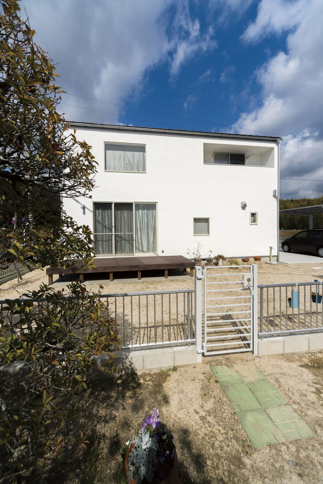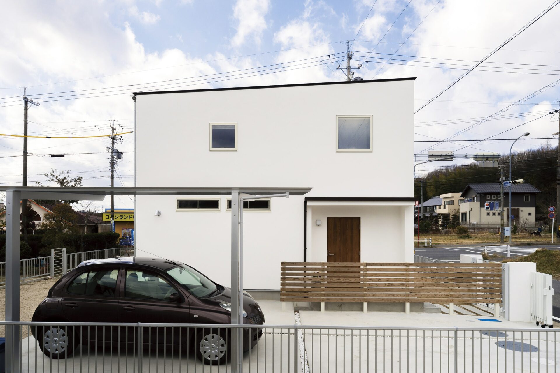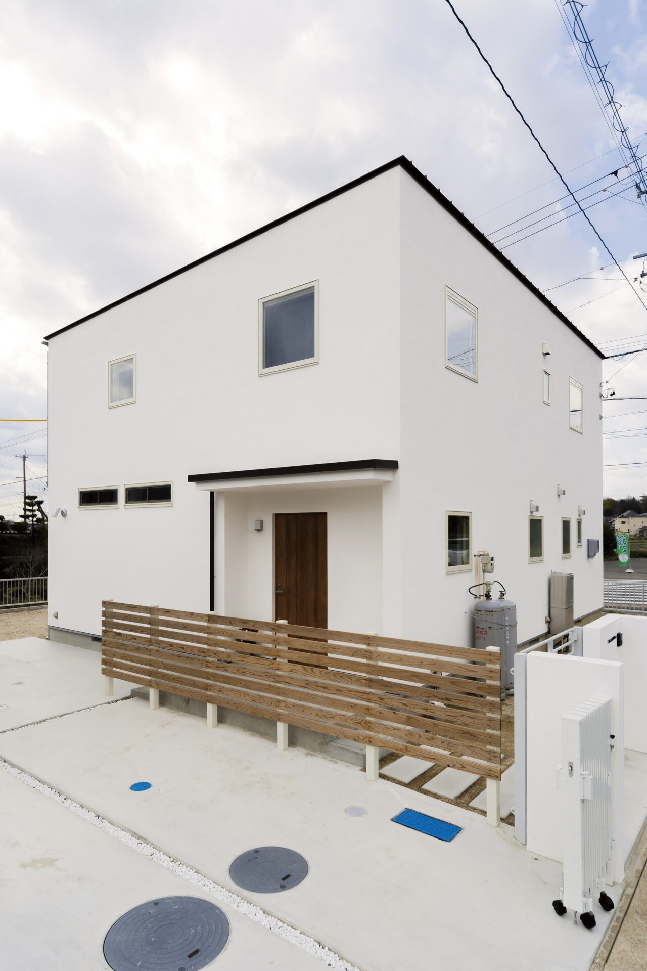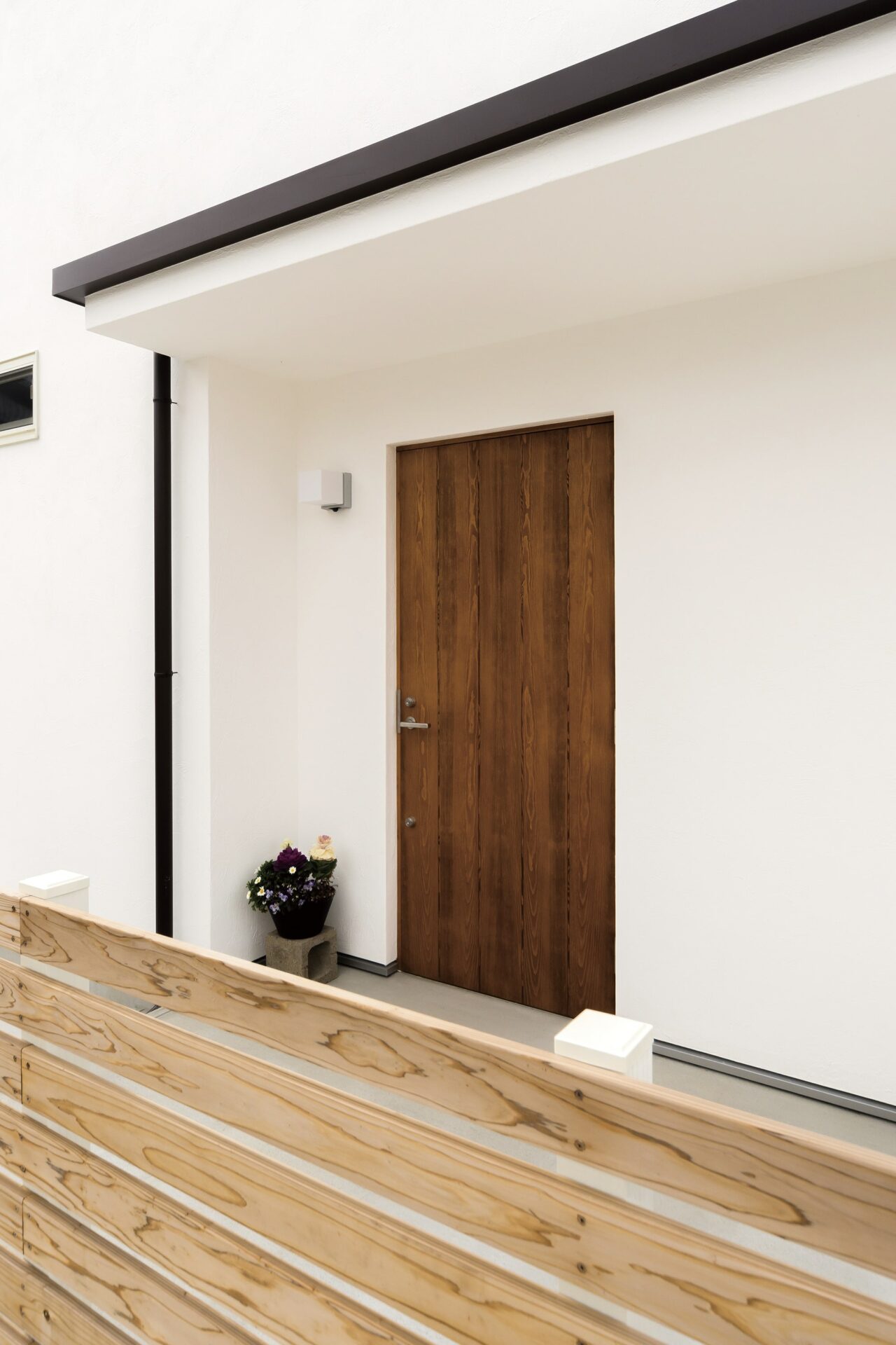 一切の無駄を排した洗練されたスクエア型の外観。壁にはすべて漆喰が塗られ、いっそう美しい仕上がりに。自社工房で造作された無垢材の玄関戸とウッドフェンスで温かみを添え、意匠だけでなく気密性も高い造りとなっている。