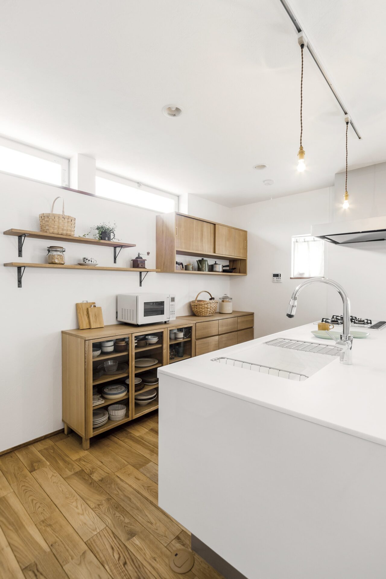 お客様、ご支給のお気に入りの家具に新たに無垢材で戸棚を追加。当社では家具も製作しているため、インテリアのご希望に応じることもできます。お客様に応じてフレキシブルな対応ができるのが注文住宅の魅力です。
