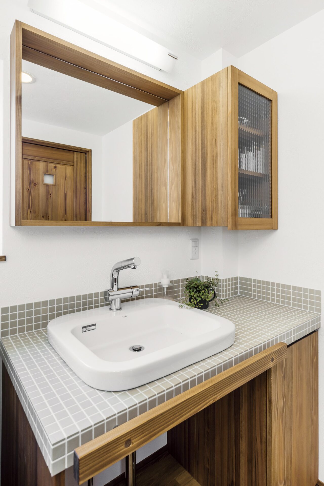 自社家具工房で作られた洗面化粧台。タイルづかいがかわいいと人気です。タイルはお好きな色をチョイスできます。
