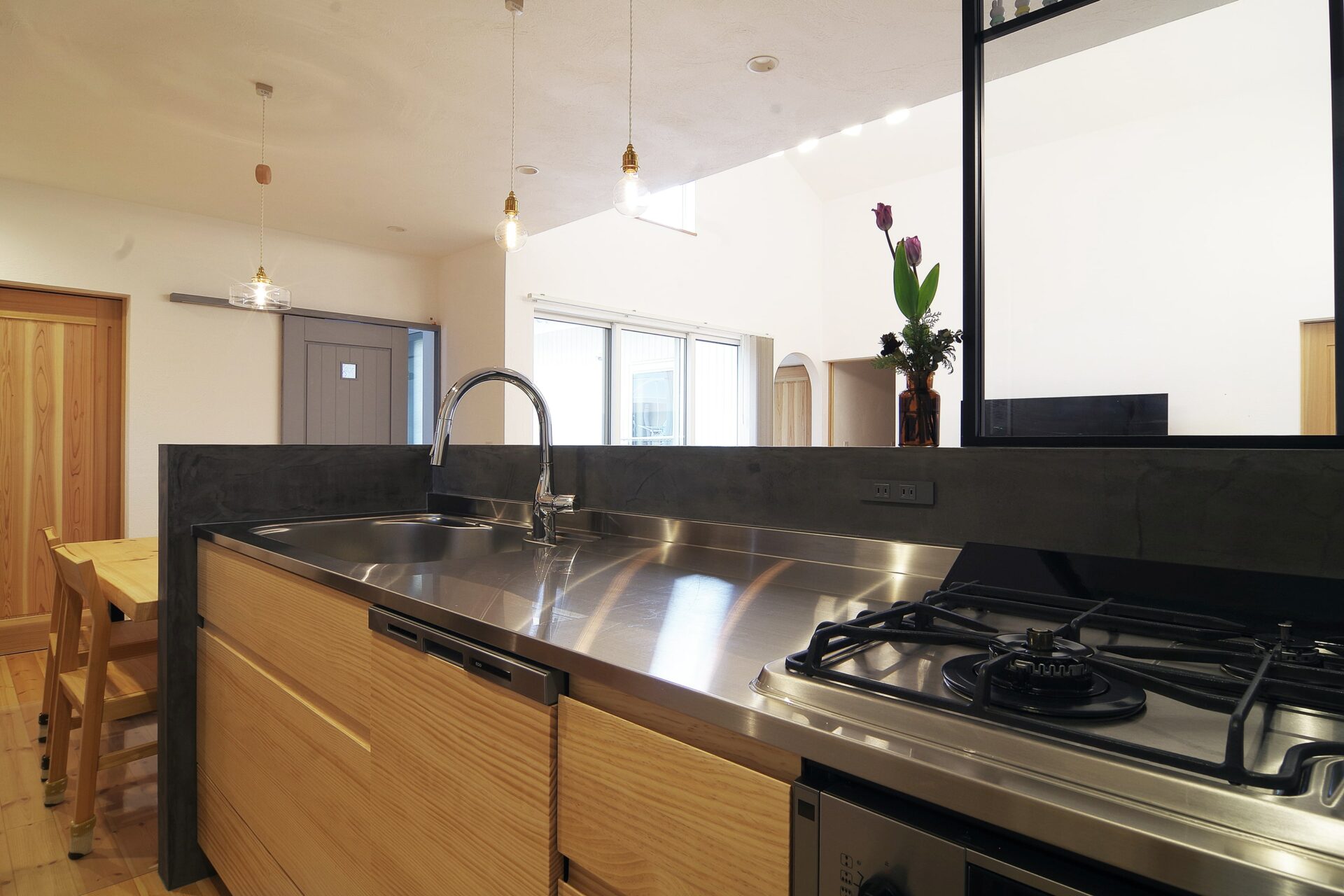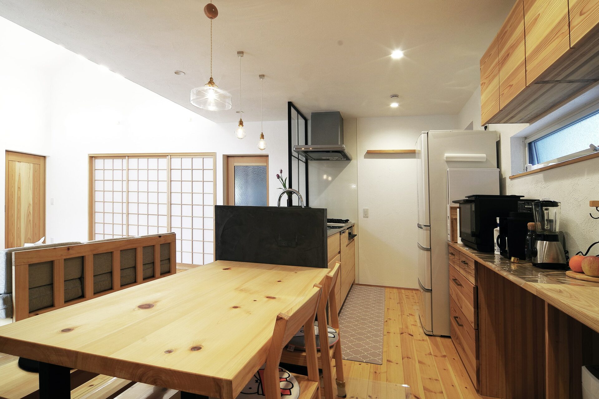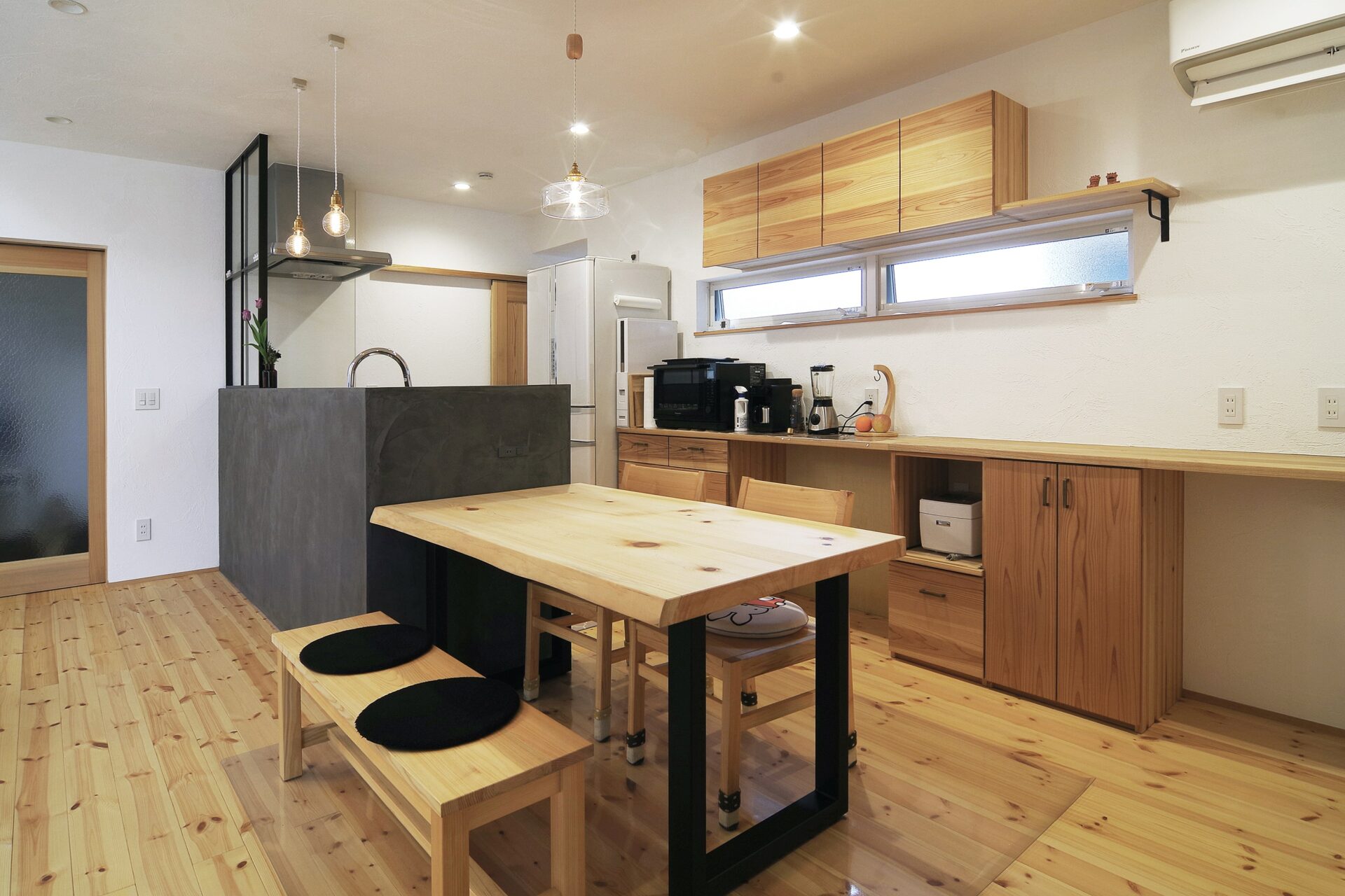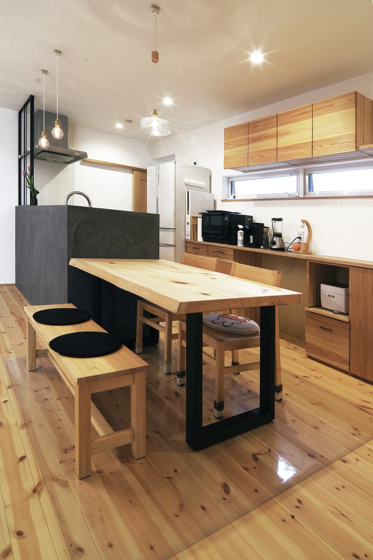 キッチン背面収納はシンプルな箱型で設計。ガラスを使用しないことで、収納内の生活感を見せないよう配慮。アイアンの足がアクセントになった造作のダイニングテーブルは一枚板風に桧をつなぎ、所々にある節をより美しくみせるようデザインしました。