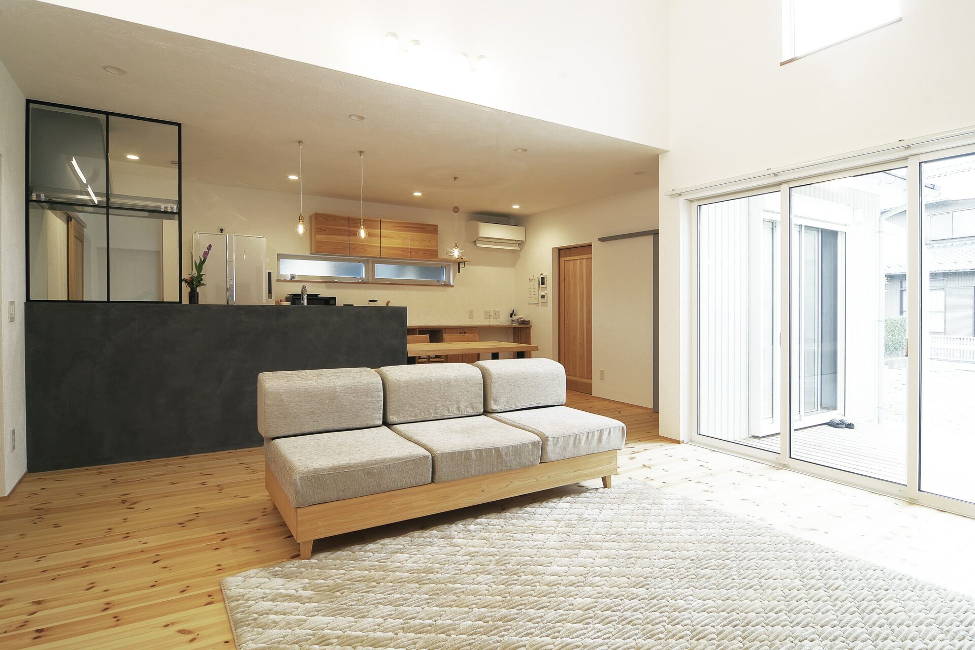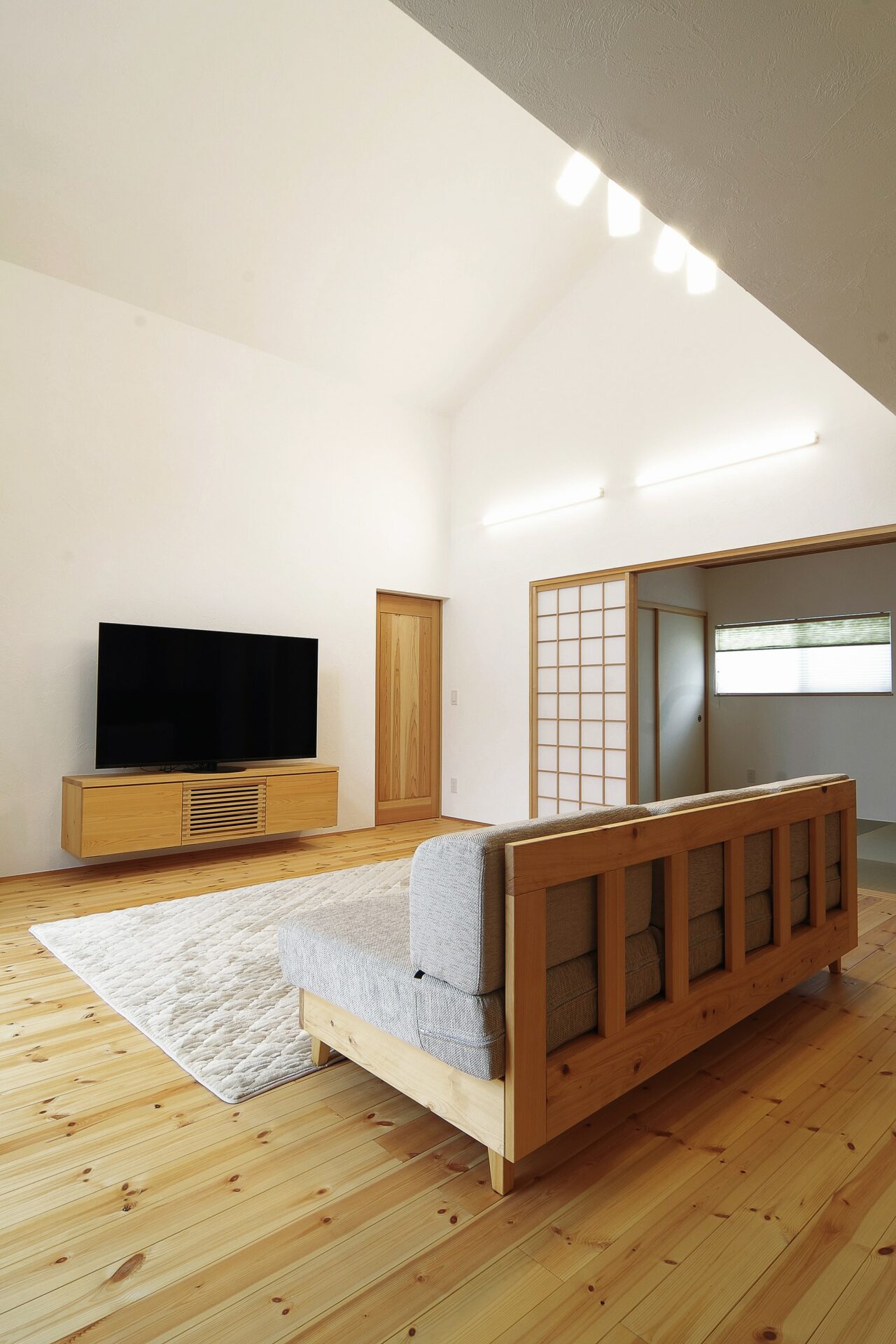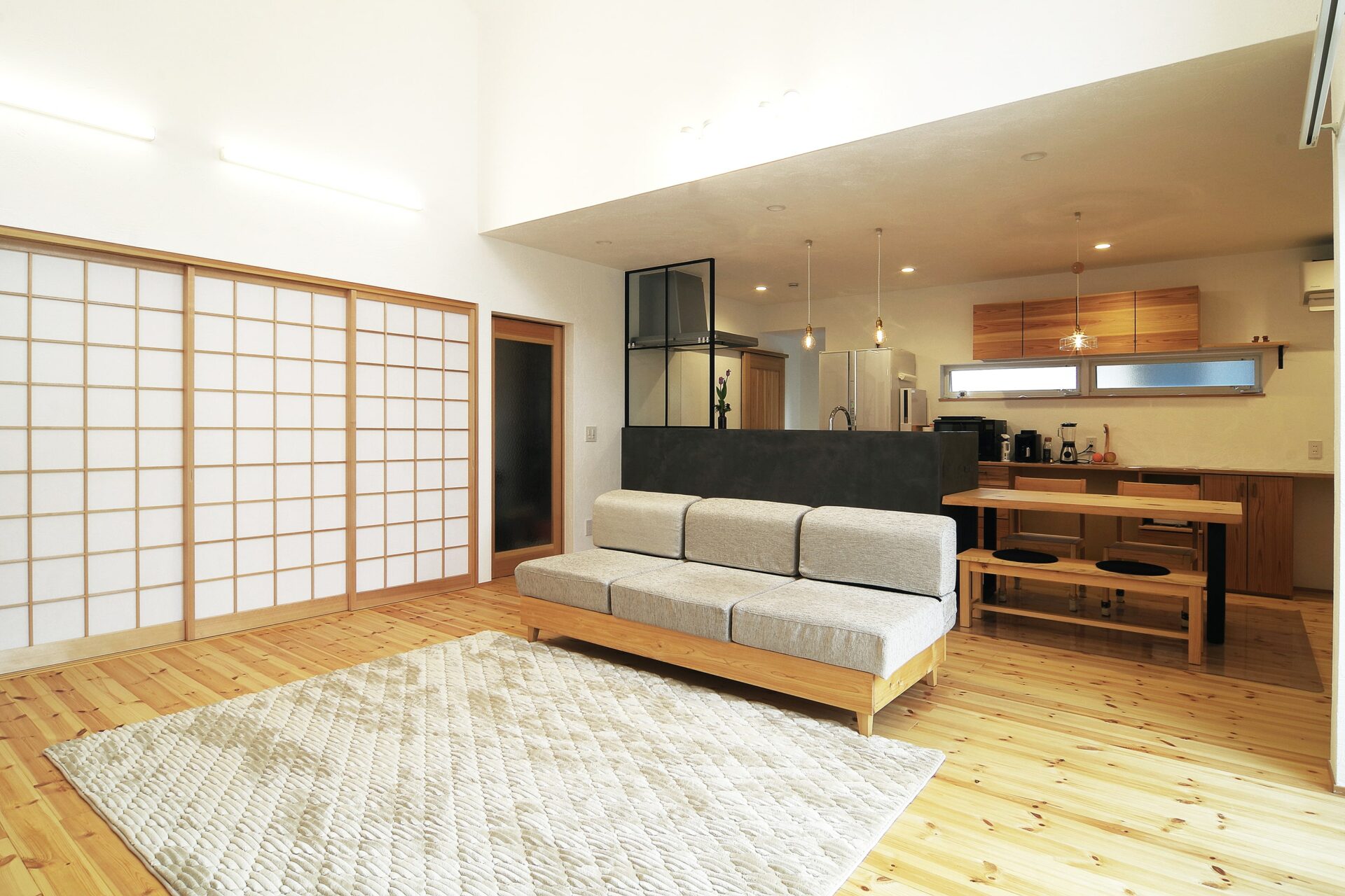 床材は無垢のパイン材を使用。木そのままのナチュラルなカラーは障子とも良く馴染み、ジャパンディな雰囲気。同社展示場を参考に造作された大型ソファも、床色と揃え塗装されているので、空間にしっくりと馴染んでいます。