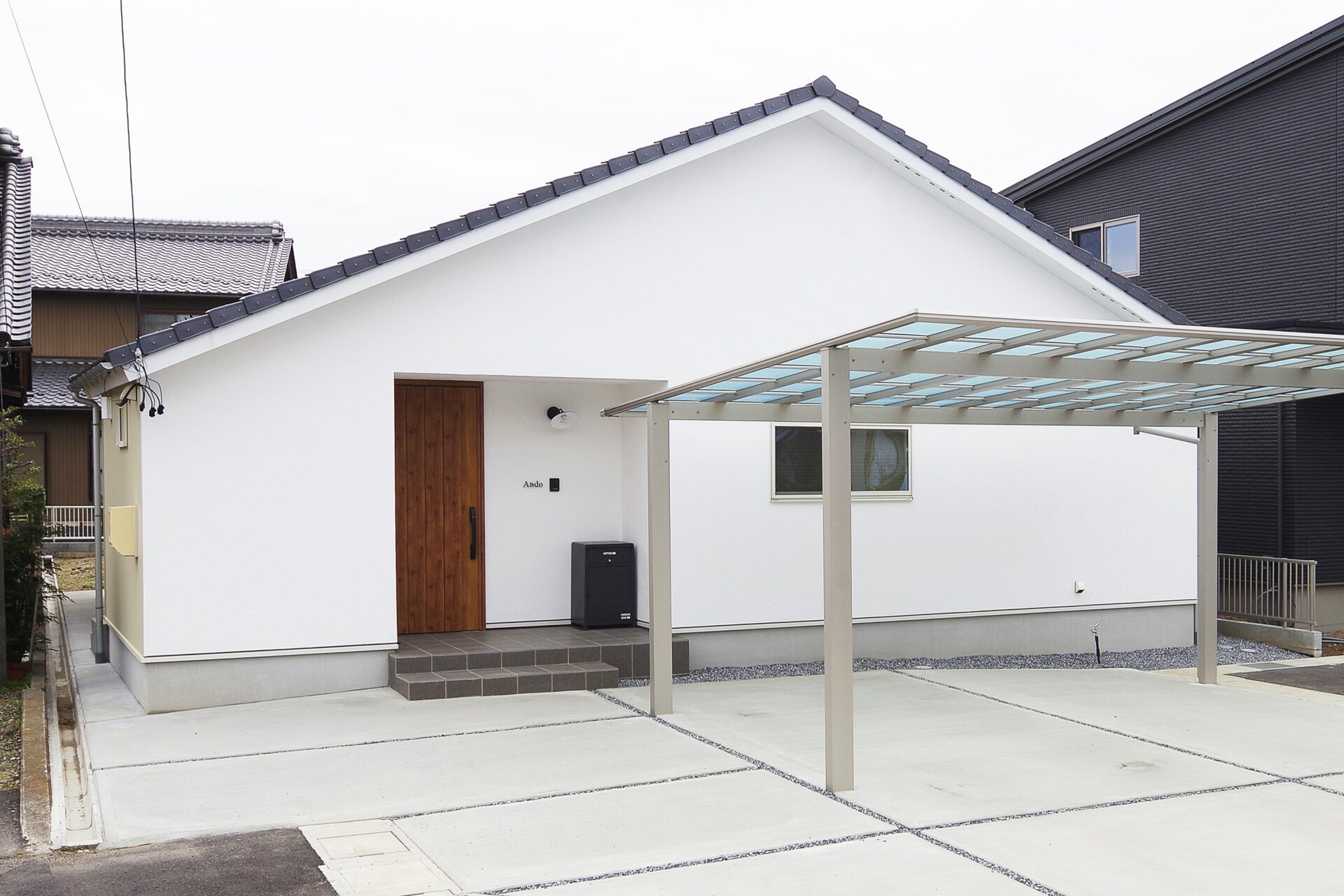 黒瓦が三角の切妻屋根を際立たせる、平屋の家です。存在感が出やすいワイドなカーポートもシャープな仕上りで、ファサードのシンプルな世界観を崩さない。漆喰の白がまぶしいシンプルな三角の外観が目を引きます。