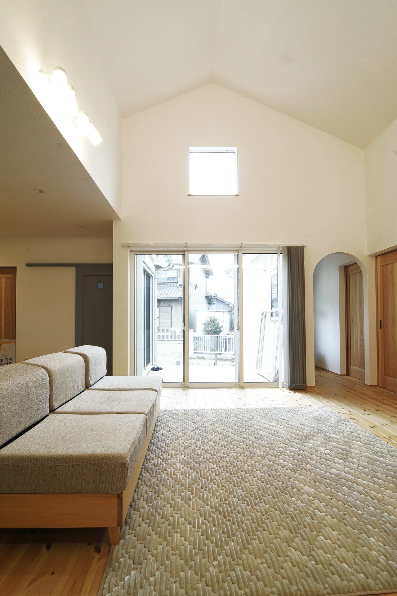 リビングは吹き抜けで開放感を出しました。床材はパインを使用。木のそのままの色がとてもナチュラルです。