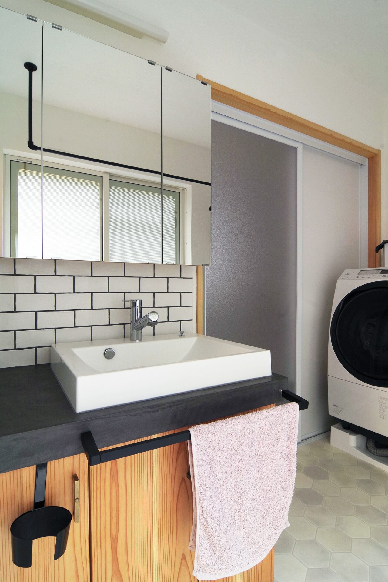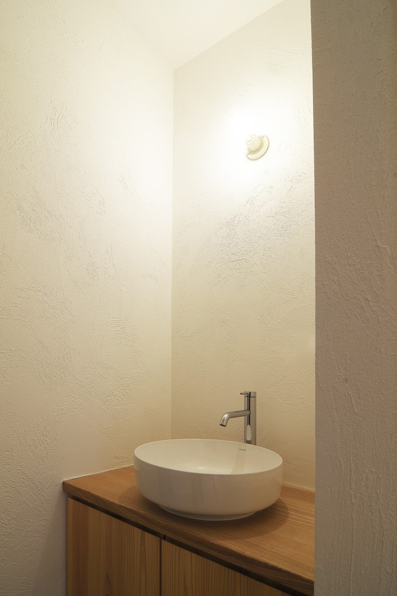 LDKとの統一感を大切にし、造作の洗面化粧台にもモールテックスを使用。ホワイトのタイルもお洒落。
