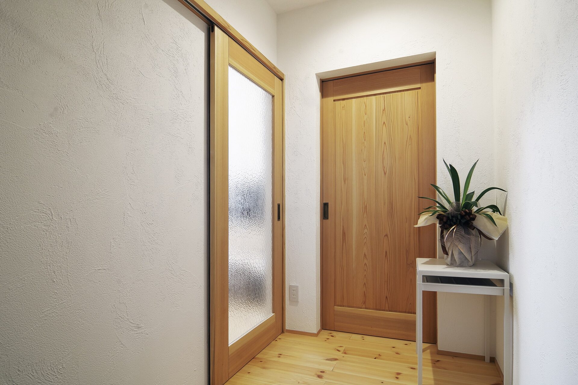 玄関ホールも余計な装飾を排除したシンプルな空間。リビング側の建具は凹凸のあるアンティークガラスで、プライバシーに配慮しながら採光を確保しています。
