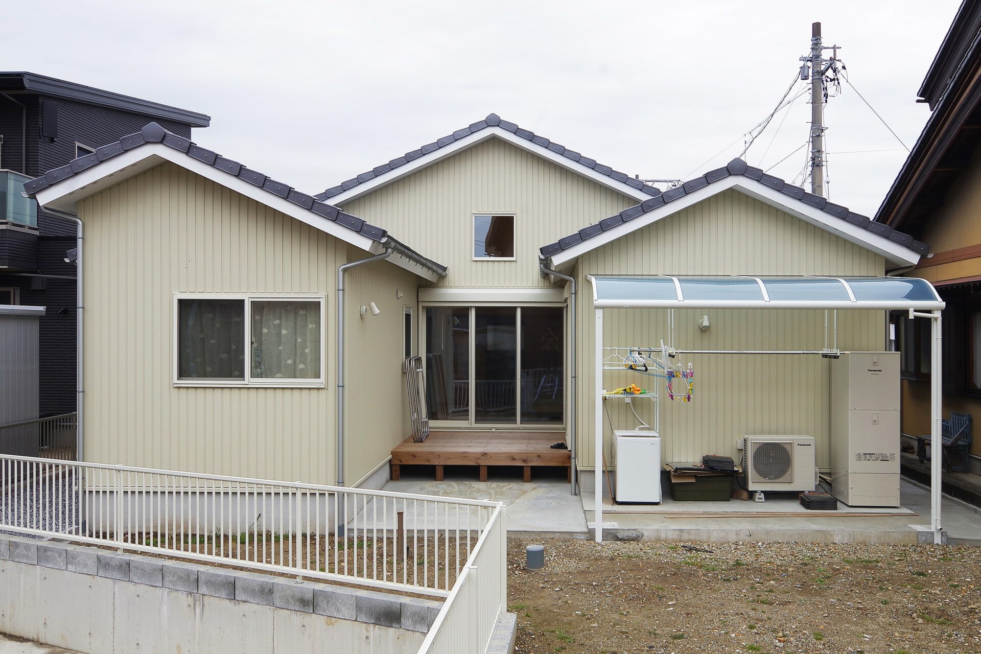 反対側から見る外観は表の印象とは全くかわります。家事動線の考えられたコの字型の間取りは洗濯場からすぐにウッドデッキに出られるなど