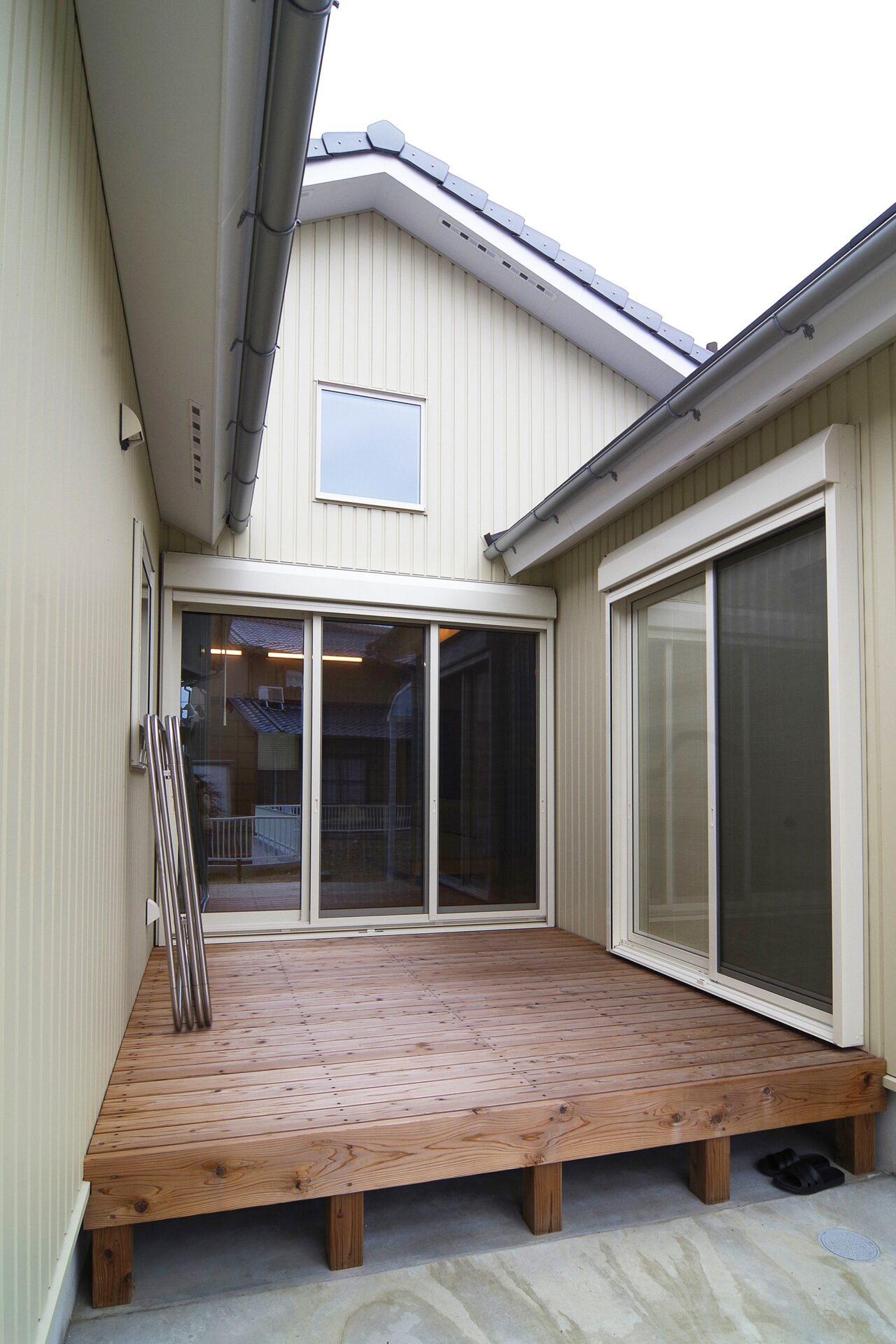 正方形の高窓が印象的なリビングから、シームレスにアクセスできるウッドデッキは家族みんなのお気に入り。左右に接する隣家からのプライバシーを守れるので、時間を気にせず寛げる『第二のリビング』として活躍します。