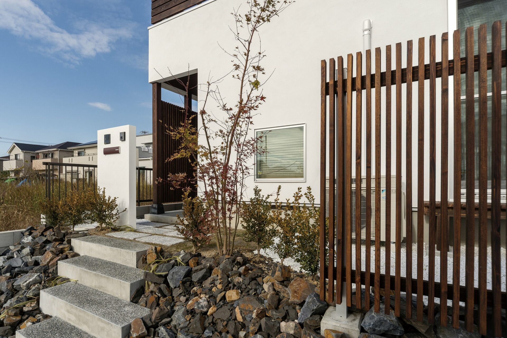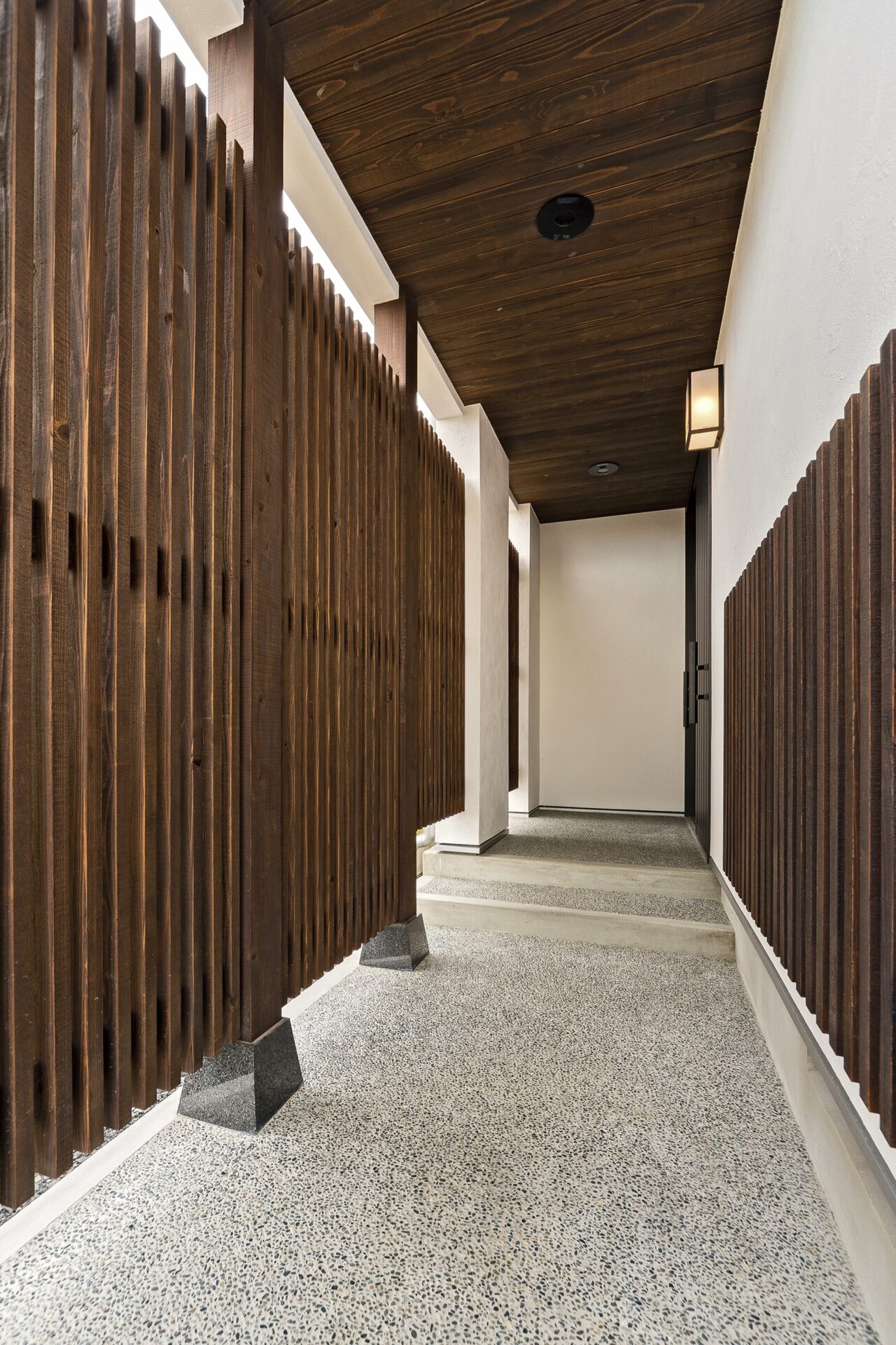 隣家の視線を遮る格子を多用したアプローチ。凛とした空気を感じさせる和の意匠です。