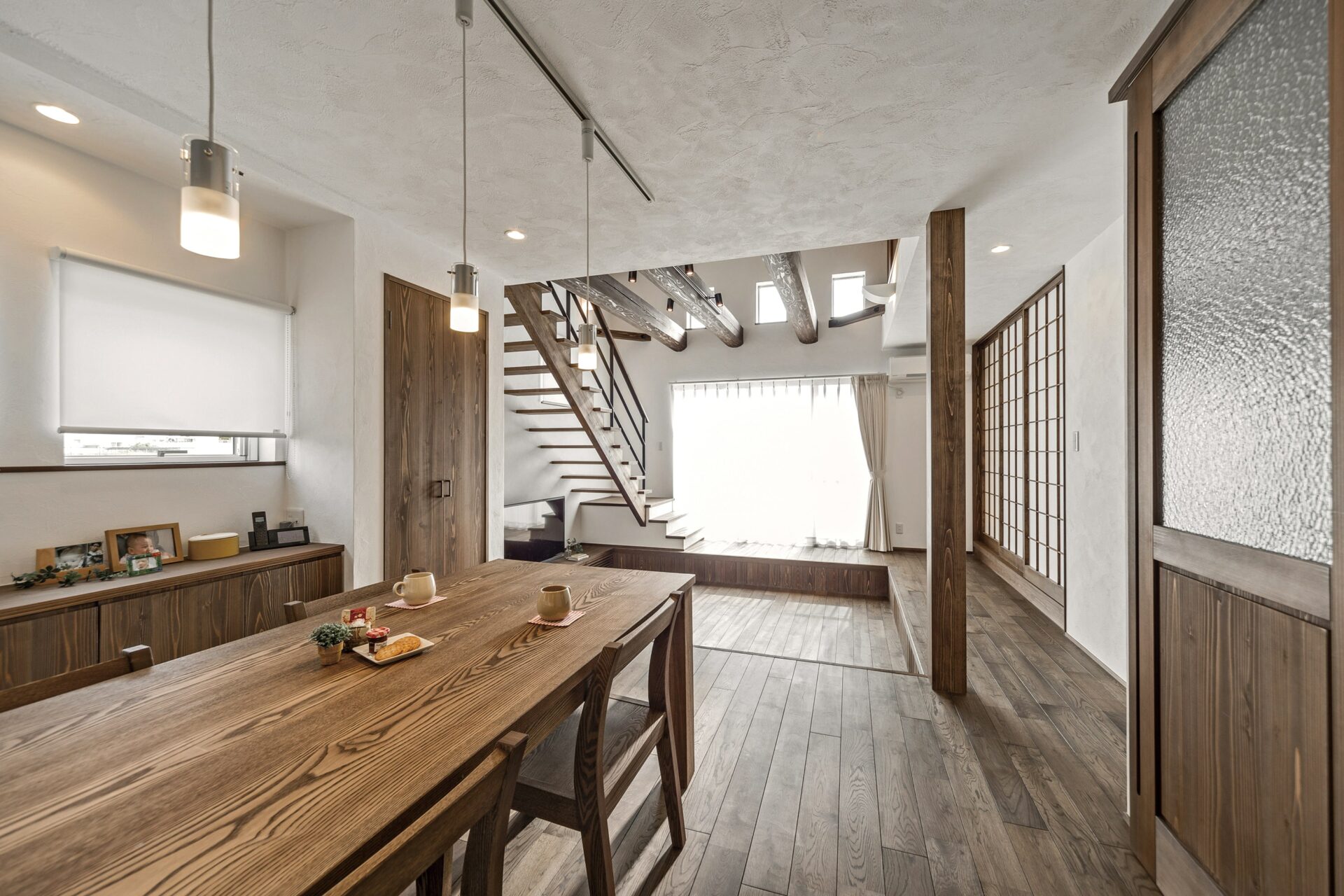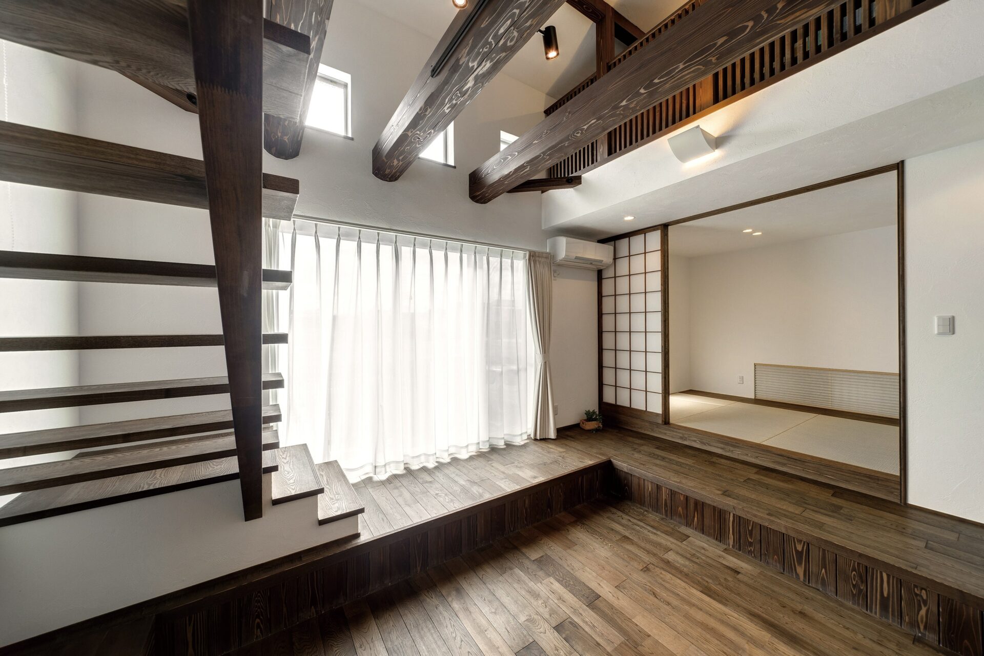 京町屋や古い社寺が好きという施主様の好みを取り入れた和カフェ風のお住まいです。高低差をつけたリビングには、ダイナミックな吹抜けに存在感バツグンの太い梁を魅せて開放的な空間となりました。