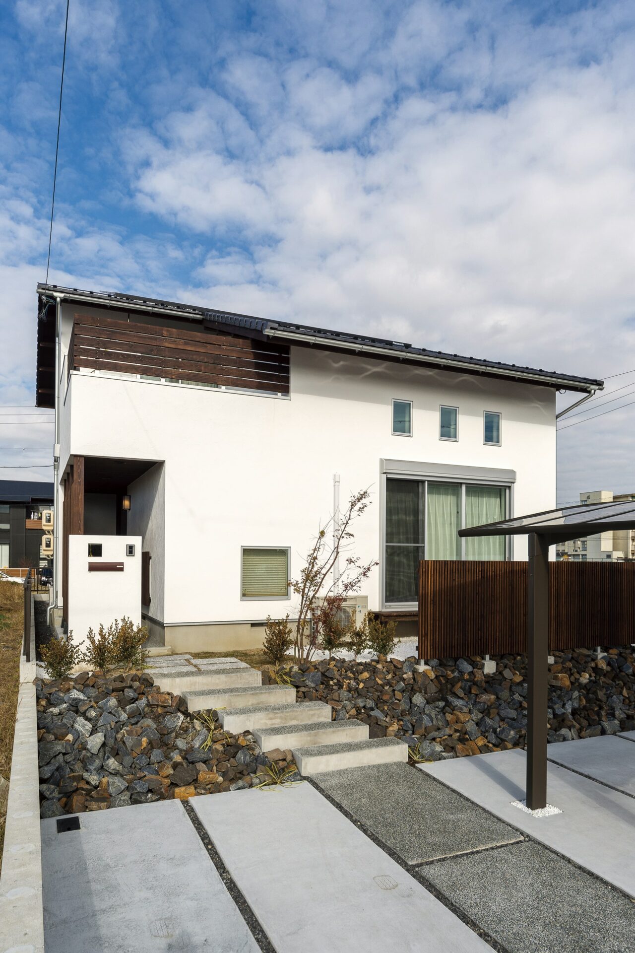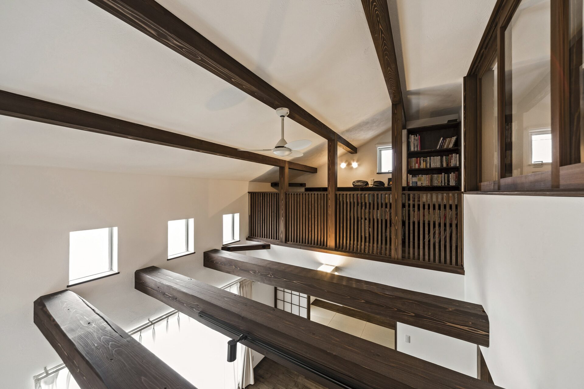 段差を囲うようなストリップ階段にアイアンの手すりでモダンな雰囲気に。煤けたような深い色合いも、ノスタルジックでどことなく和の趣を感じさせられます。古民家風でありながら新しい和のカタチを創造できるのも注文住宅だからこそです。