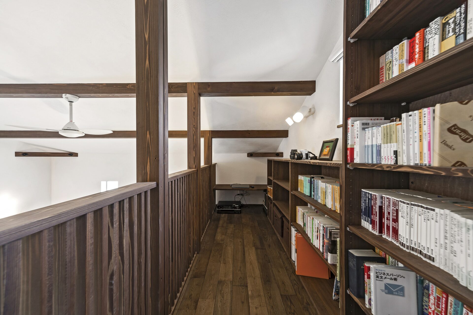 斜め天井を利用したブックスペース。本棚も自社家具工房で作られているので全体の雰囲気を壊さず空間に馴染みます。