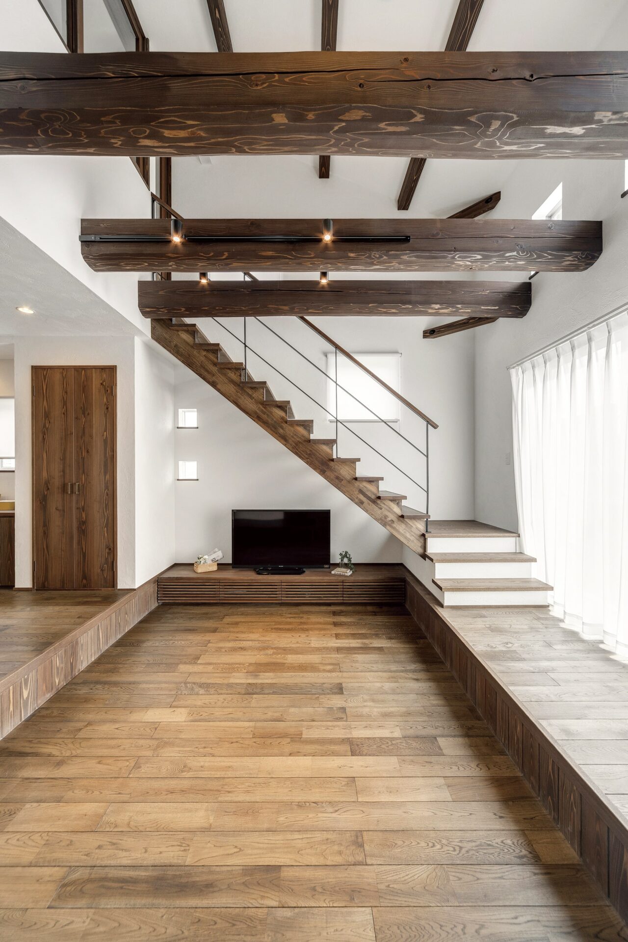 ストリップ階段と太い梁に勾配天井。オシャレな古民家を連想させ、ゆっくりとした時間を過ごせそうです。「段差は腰をかけたり、もたれたり。ソファのように使っています」とK様
