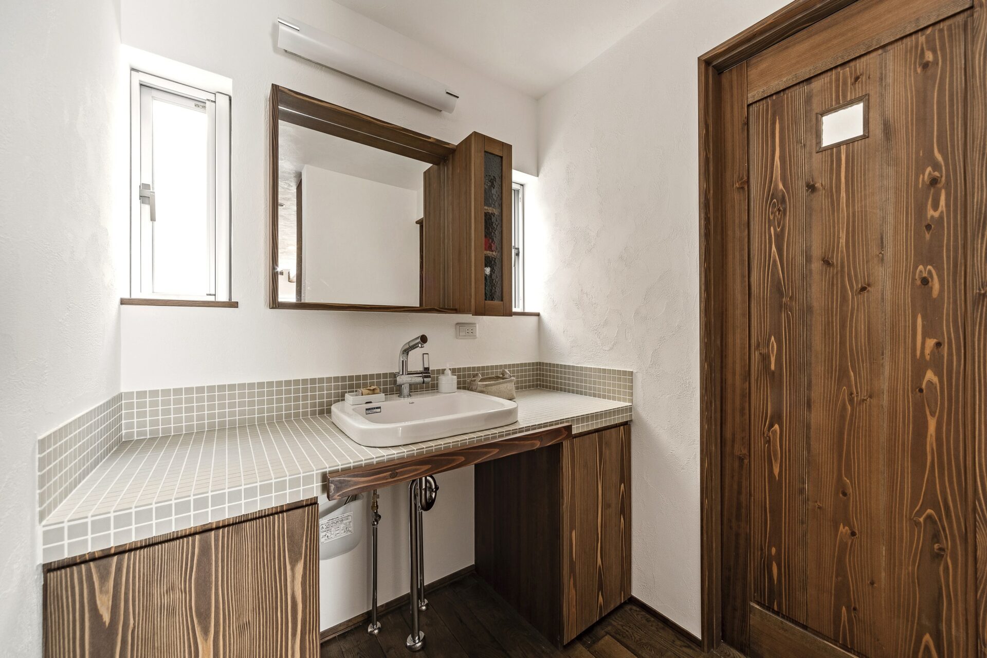 和カフェのお店にありそうな洗面化粧台。タイル使いと無垢の木のテイストが上手にマッチしました。