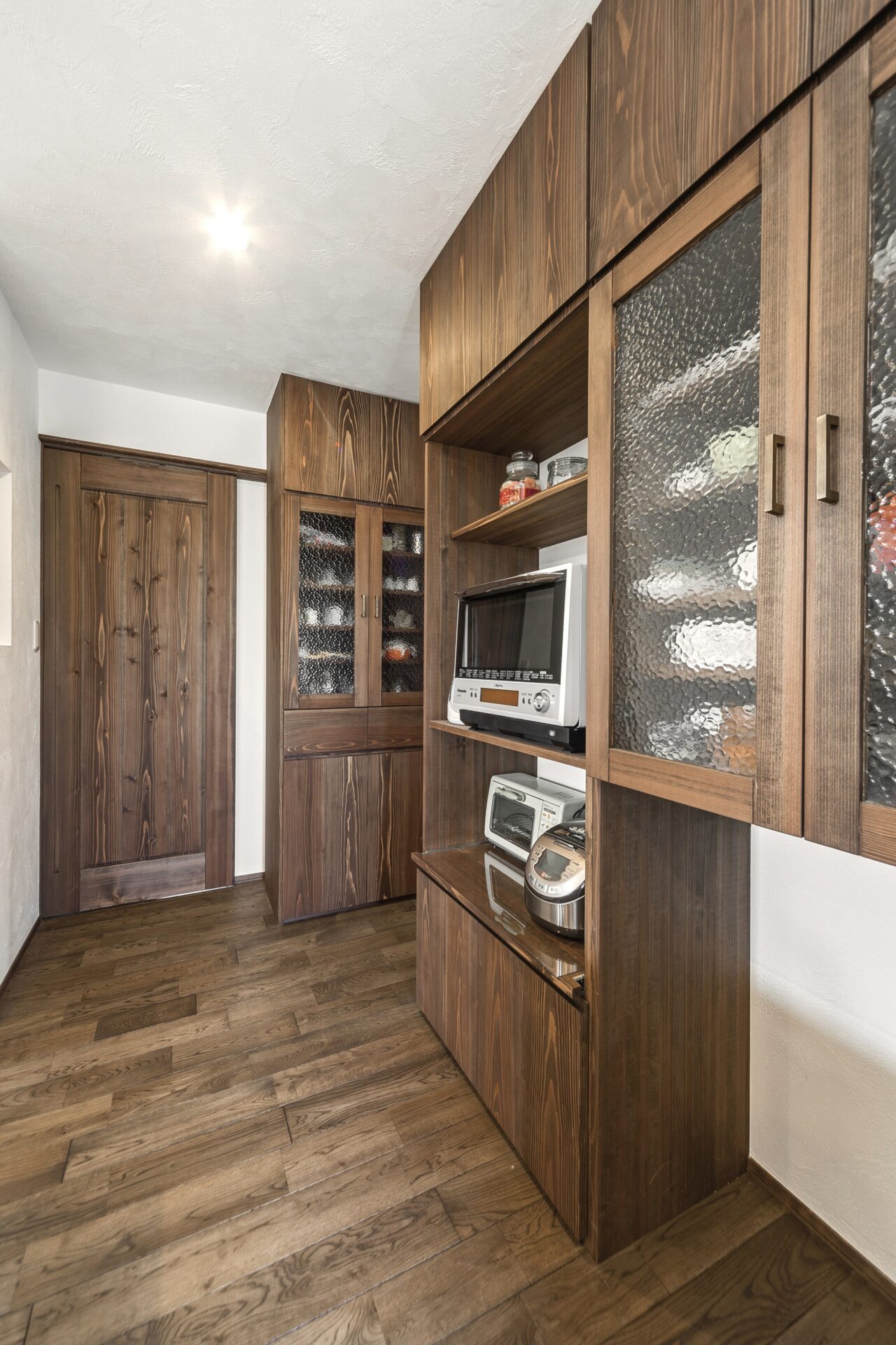 キッチン収納もオリジナルだからこそ使い勝手もよく、空いたスペースにゴミ箱が設置できます。注文住宅だから自分好みの家になること間違いなし!