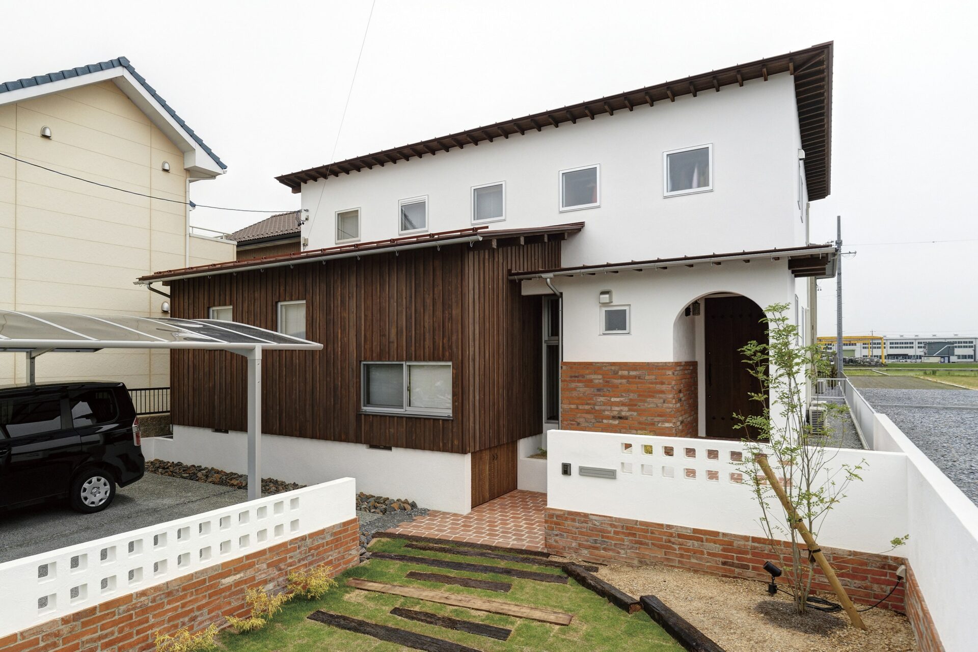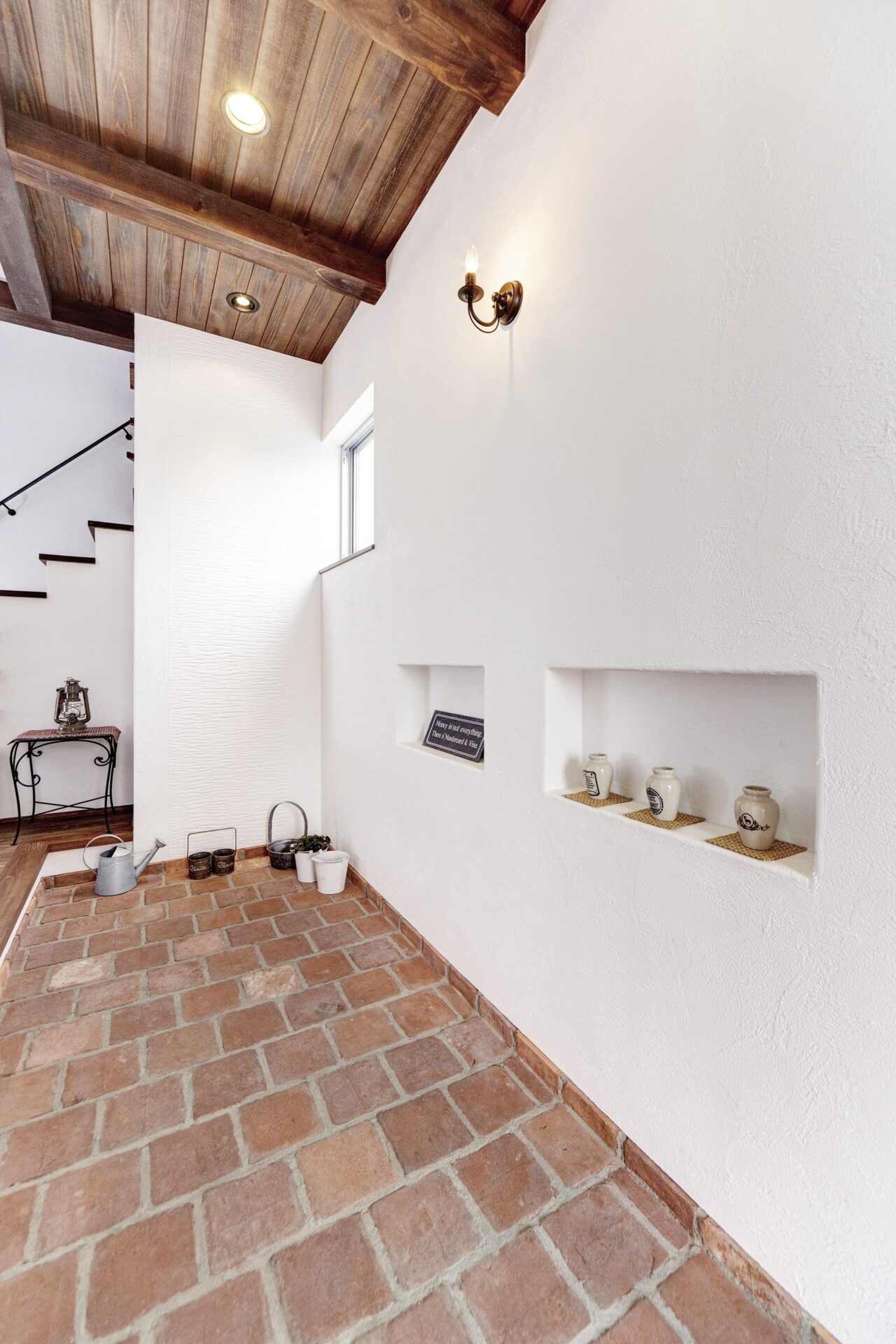 土間のように使える奥行ある玄関。風合いあるレンガを屋外のアプローチから玄関まで敷くことで、外と中の概念を曖昧にし外構とのつながりを表現しました。