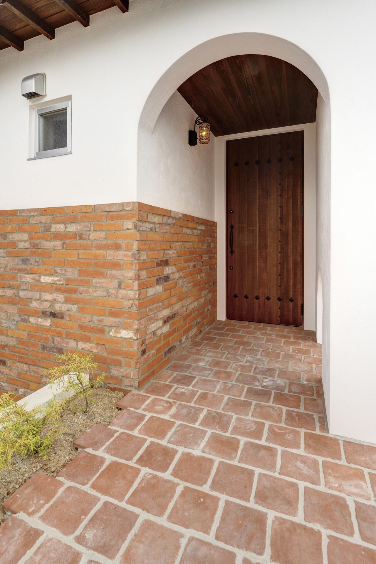 玄関の扉も自社工場のオリジナル。アーチとレンガ壁がアンティークな雰囲気です。