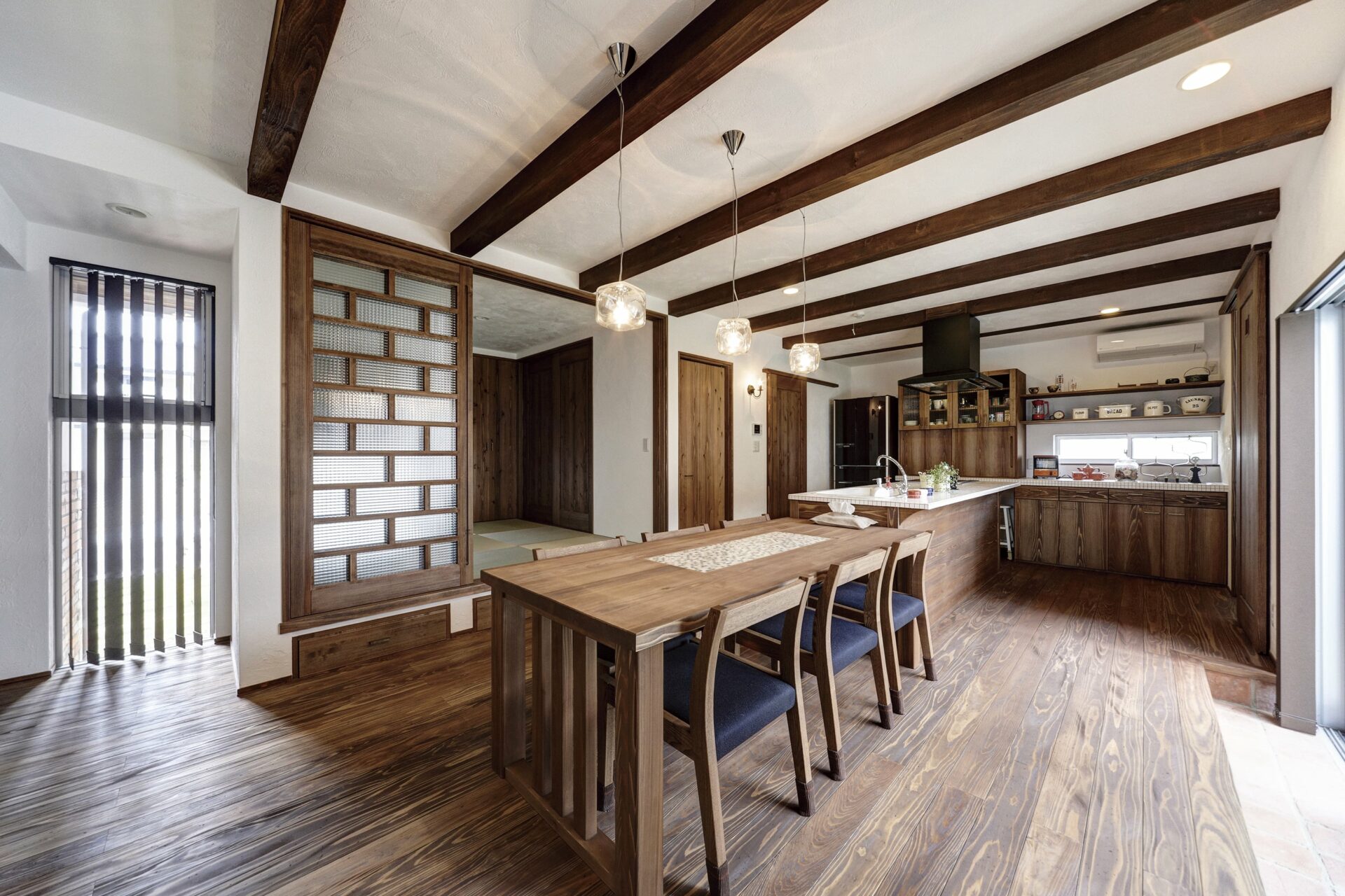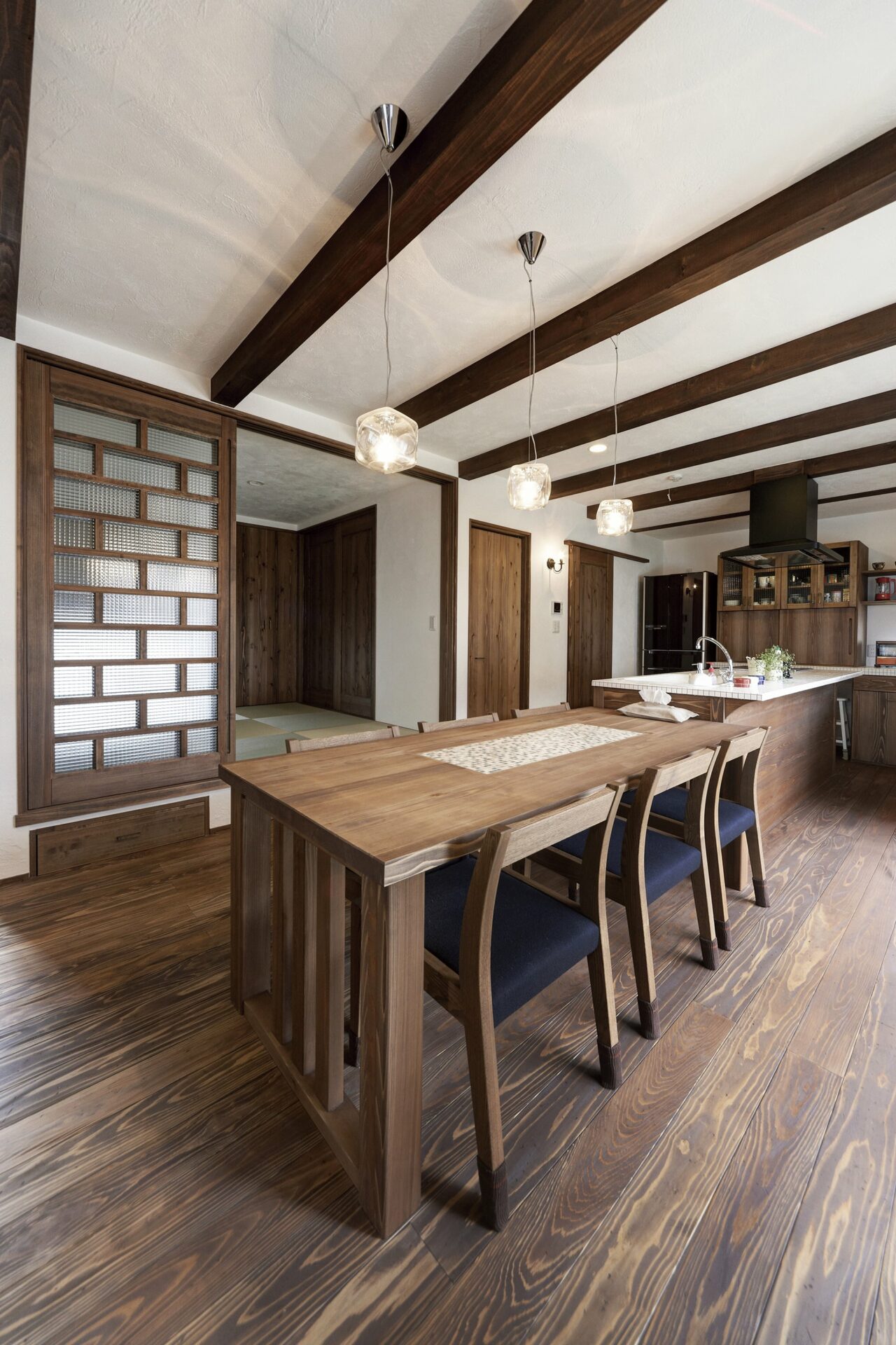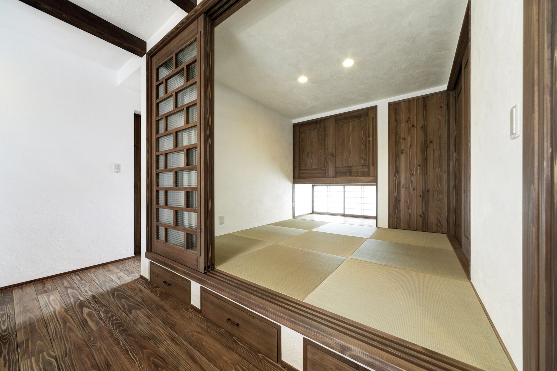 一段あがった和室の下は収納として利用できます。どこか懐かしく感じる建具は自社工場で作られたものです。
