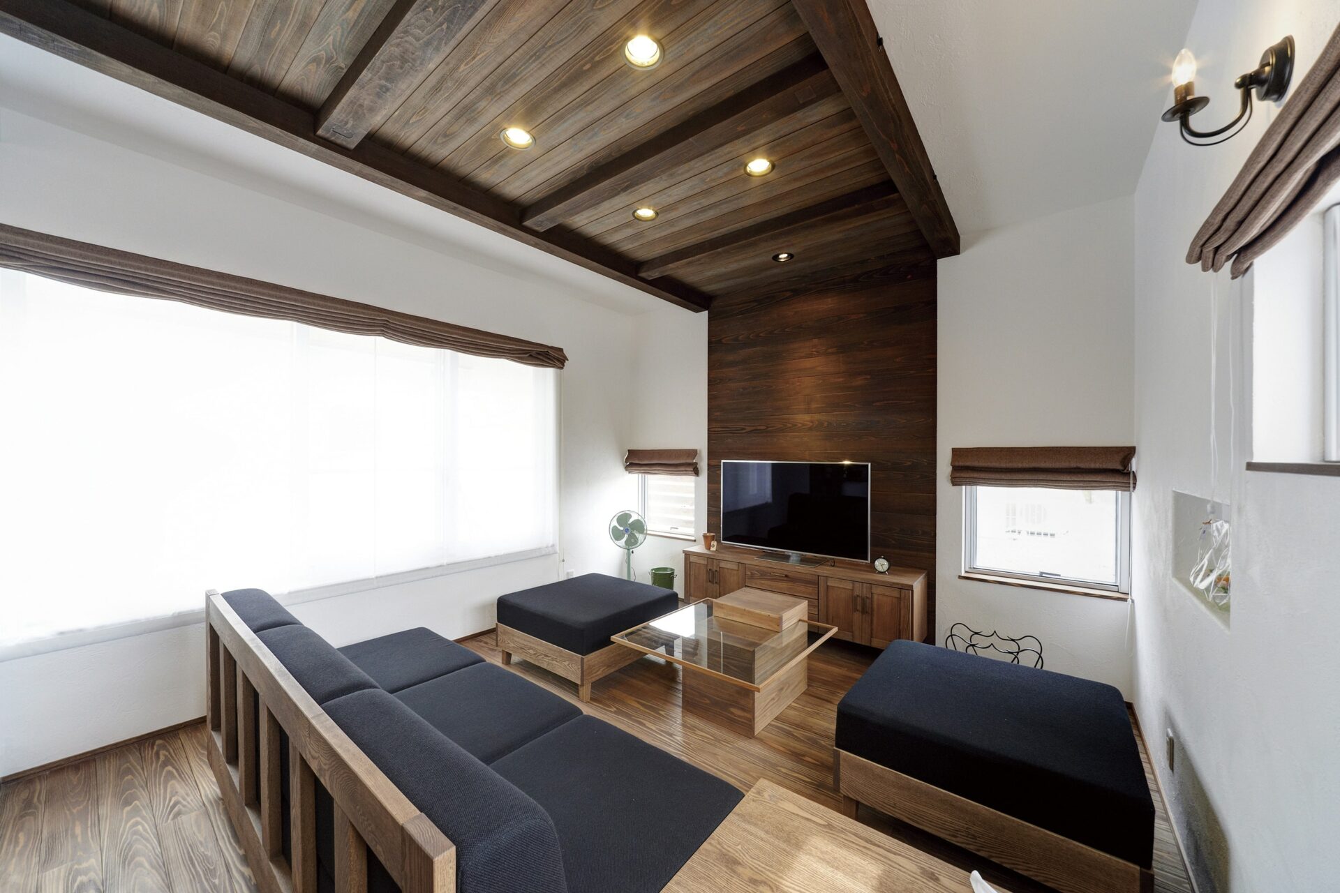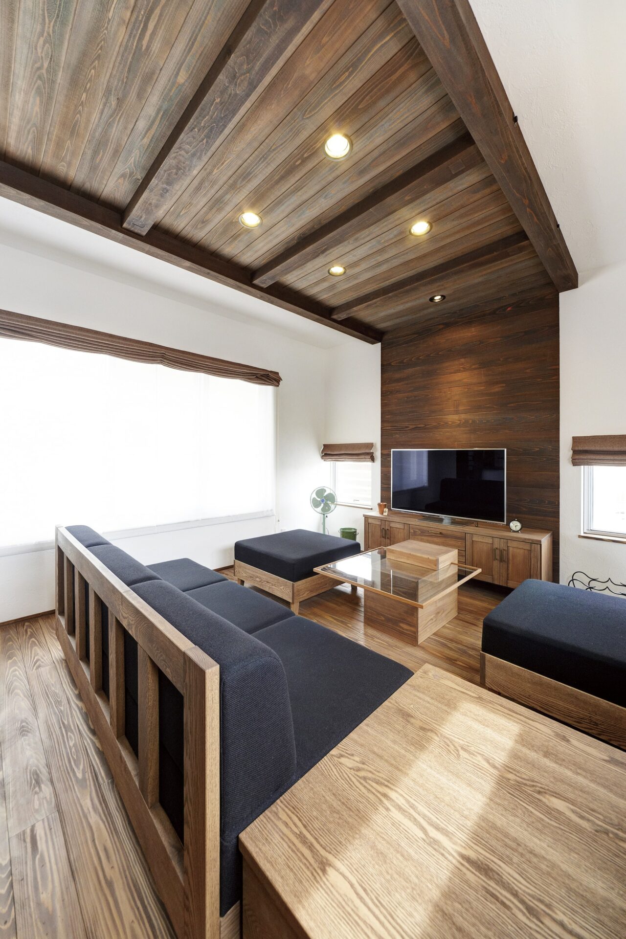 天井の杉板からつながるアクセントウォールが特徴的。ソファ・TVボードなど家具は全て自社工場でひとつひとつ作られたオリジナルです。