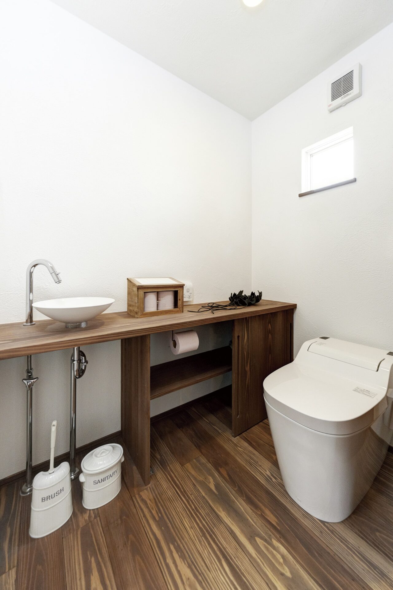 無垢材の手洗い付きカウンター。ペーパーを保管するBOXやホルダーもかわいい。