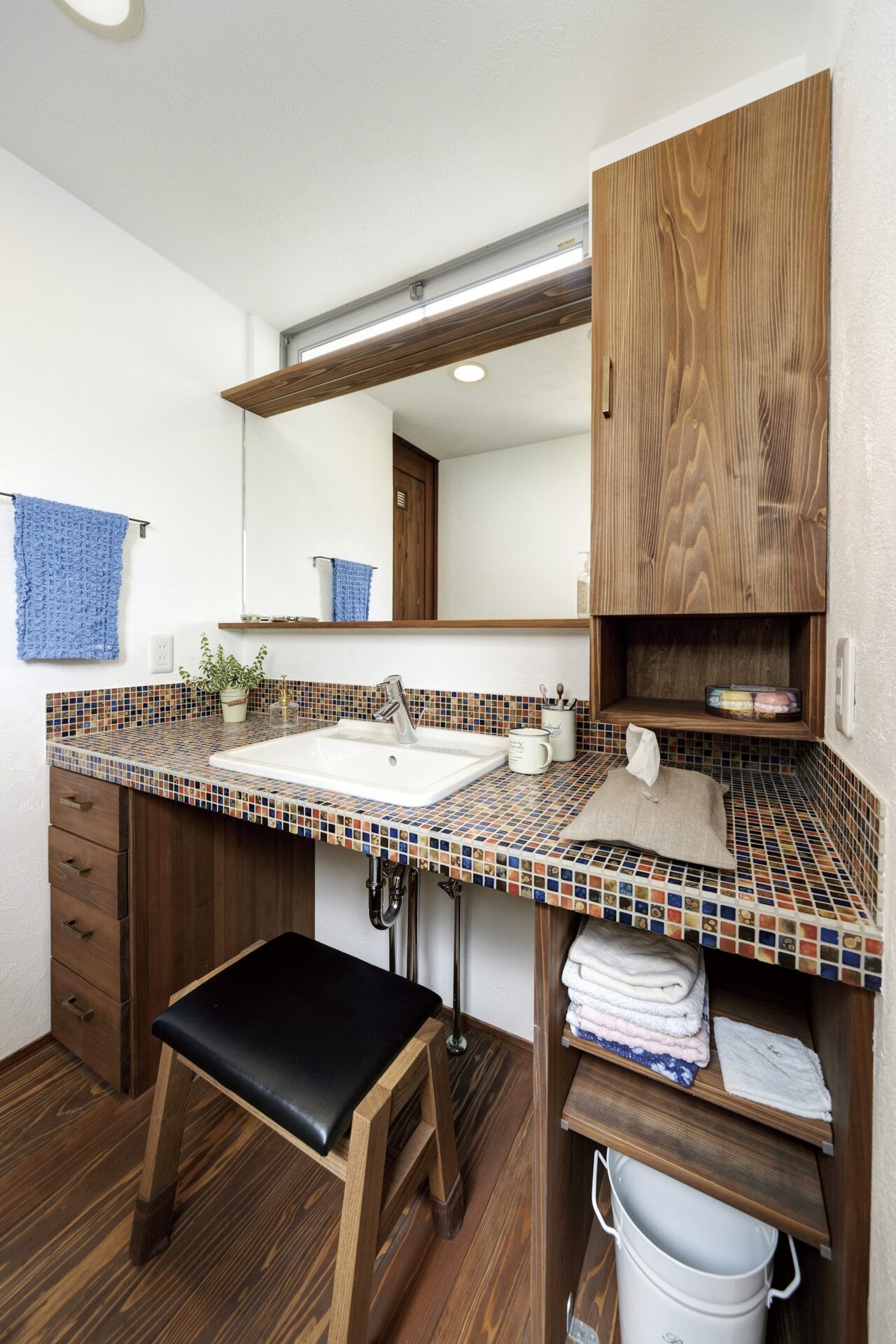カラフルなモザイクタイルがかわいらしいオリジナルの洗面化粧台は友人からも好評価だそう!強アルカリ性の漆喰壁なら、水はねしてもカビがはえにくくお手入れ簡単です。