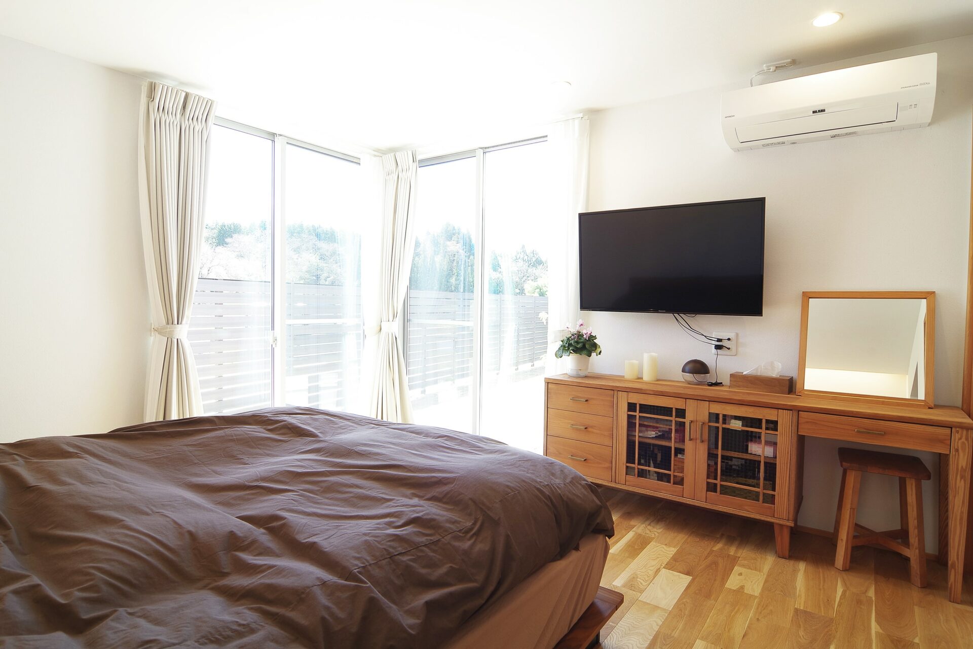 一日の疲れをリセットしてくれる寝室。化粧台は自社家具工房のオリジナルです。
